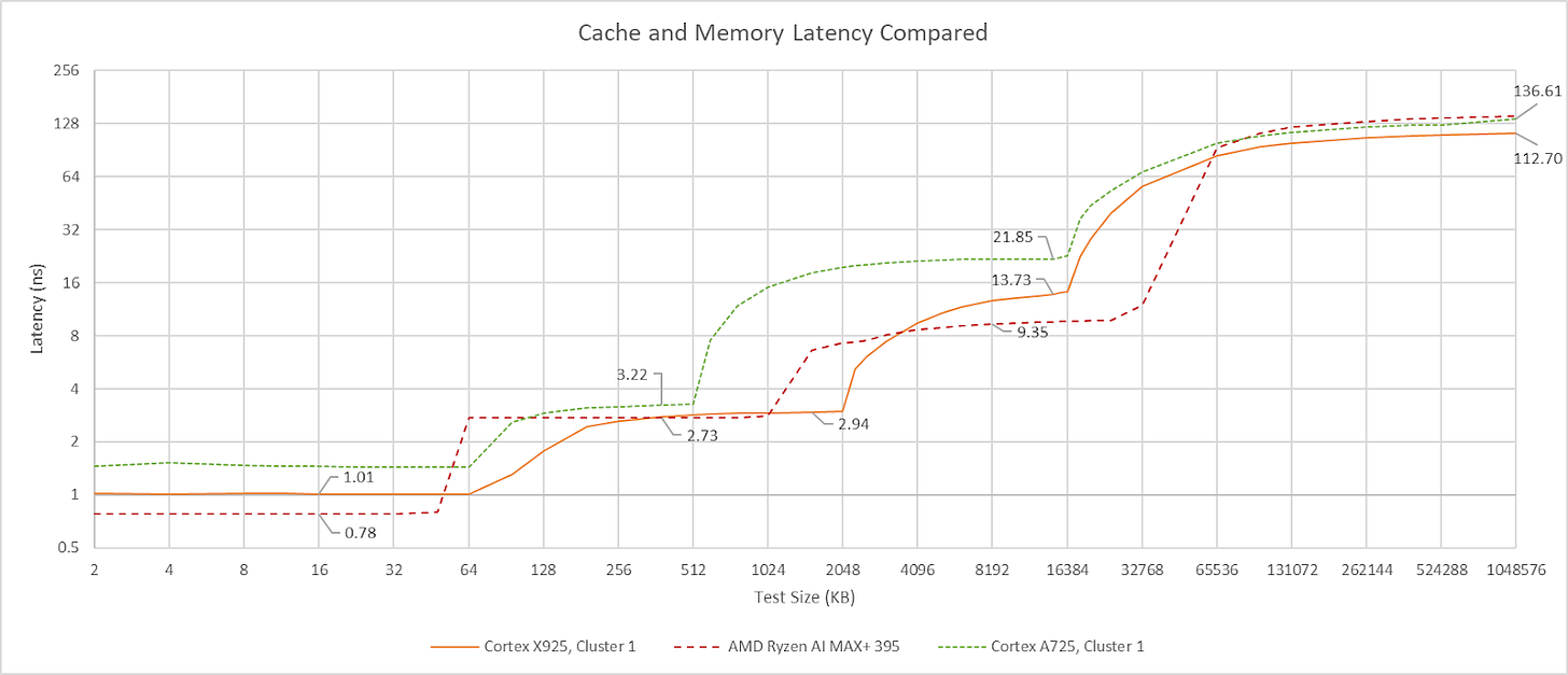AMD’s Zen 5 in Strix Halo has smaller but faster core-private caches. GB10’s X925 and A725 cores have good cycle count latencies, but Zen 5 can clock so much higher that its caches end up being faster, if just barely so at L2. AMD’s L3 design continues to impress, delivering lower latency even though it has twice as much capacity.