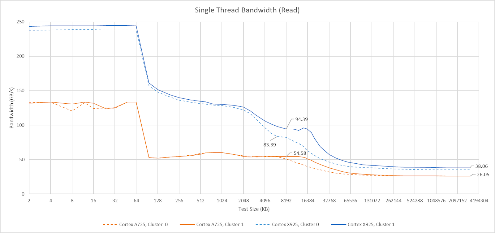 Core-private bandwidth figures are straightforward. A725 cores can read from L1 at 48 bytes per cycle, and appear to have a 32B/cycle datapath to L2. A single A725 core can read from L3 at ~55 GB/s. X925 has more impressive bandwidth. It can read 64B/cycle from L1D, likely has a 64B/cycle path to L2, and can sustain nearly 90 GB/s of read bandwidth from L3. Single core DRAM bandwidth is also higher from a X925 core, at 38 GB/s compared to 26 GB/s from an A725 core.