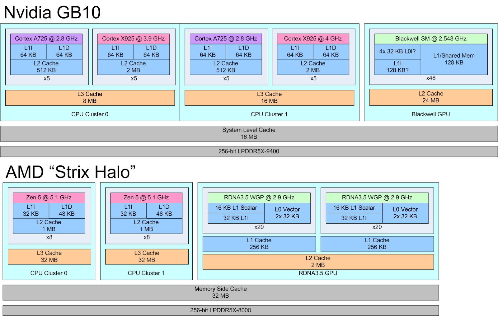 GB10’s CPU setup feels very density optimized compared to Strix Halo’s.GB10 has 20 CPU cores to Strix Halo’s 16, and gets there using a highly heterogeneous CPU configuration that’s light on cache. My initial thought is that all else being equal, I would prefer 32 MB of fast cache in a single level over 16 MB of L3 and 16 MB of slower system level cache. That said, performance is a complicated topic and I’m still working on benchmarking both Strix Halo and GB10. GB10’s memory subsystem has bright points too. Its DRAM latency is outstanding for a LPDDR5X implementation. Mediatek has also seen fit to give one cluster over 100 GB/s of external read bandwidth, which is something AMD hasn’t done on any client design to date.