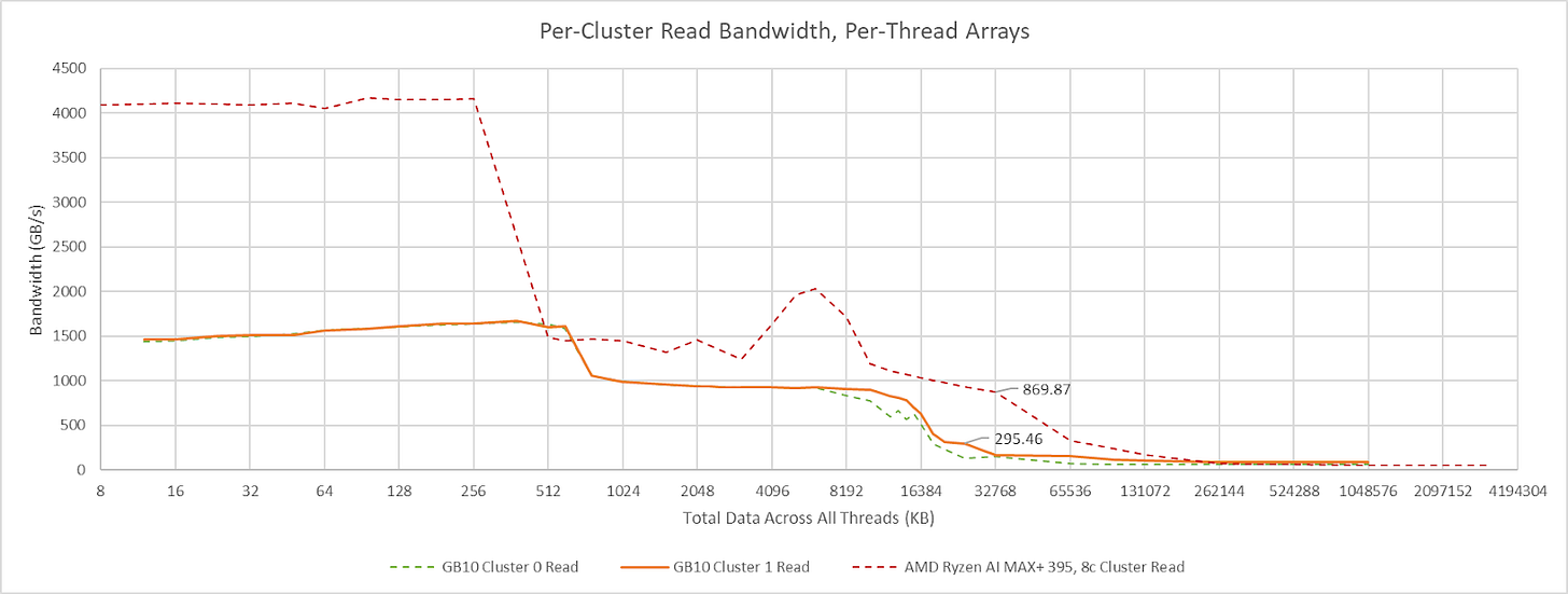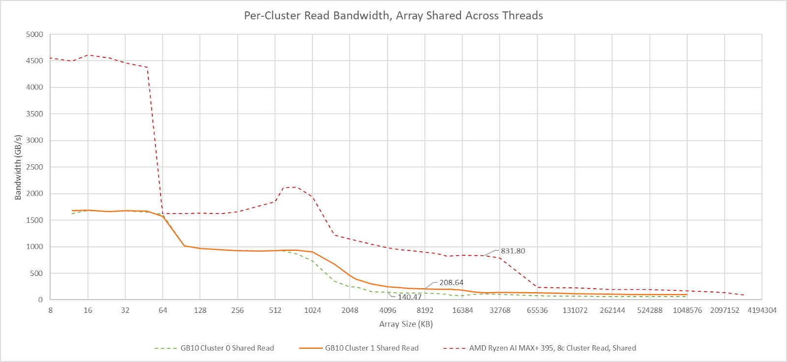 Shared components in the memory hierarchy face more pressure in multithreaded workloads, because having more cores active tends to multiply bandwidth demands. Normally I test multithreaded bandwidth by having each thread traverse a separate array. That prevents access combining, because no two threads will request the same address. It also shows the sum of cache capacities, because each core can keep a different part of the test data footprint in its private caches. GB10 has 15 MB of L2 across cores in each cluster, but only 8 or 16 MB of L3. Any size that fits within L3 will have a substantial part contained within L2.