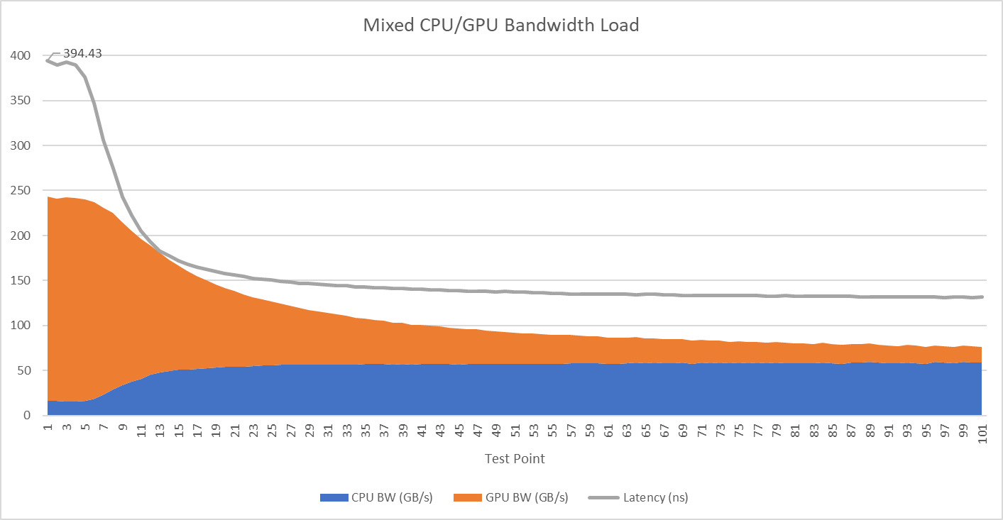 I only generate bandwidth load from the GPU in the test above, and run a single CPU latency test thread. Mixing high CPU and GPU bandwidth demands makes the situation more complicated.