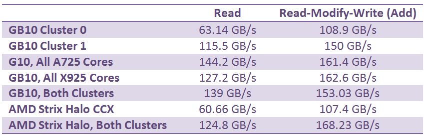 Pointing all threads to the same array carries the risk of overestimating bandwidth if accesses get combined, but that seems to happen only after a shared cache. I initially validated bandwidth testing methodologies on Zen 2 and Skylake. There, shared array results generally aligned with L3 performance counter data. Using shared array results on GB10 provides another data point to evaluate L3 performance. Taken together with results using thread-private arrays, they suggest GB10 has much lower L3 bandwidth than AMD’s Strix Halo. However, it’s still respectable at north of 200 GB/s and likely to be adequate.