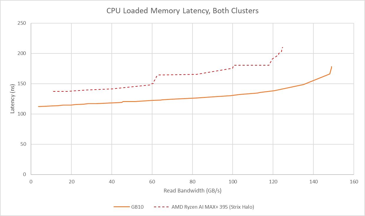Loading cores across both clusters shows GB10 maintaining lower latency than Strix Halo over the achieved bandwidth range. GB10’s combination of lower baseline latency and high external bandwidth from Cluster 1 put it well ahead.