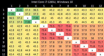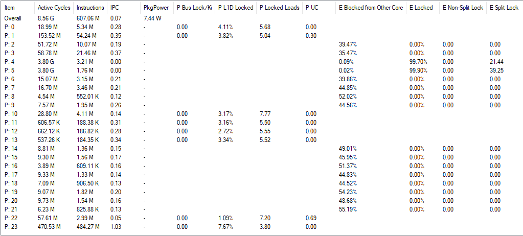 I have a core to core latency test that bounces an incrementing counter between cores using _InterlockedCompareExchange64. That compiles to lock cmpxchg on x86-64, which is an atomic test and set operation. I normally target a value at the start of a 64B aligned block of memory, but here I’m modifying it to push the targeted value’s start address to just before the end of the cache line. Doing so places some bytes of the targeted 8B (64-bit) value on the first cache line, and the rest on the next one. As expected, “core to core latency” with split locks range from bad to horrifying.