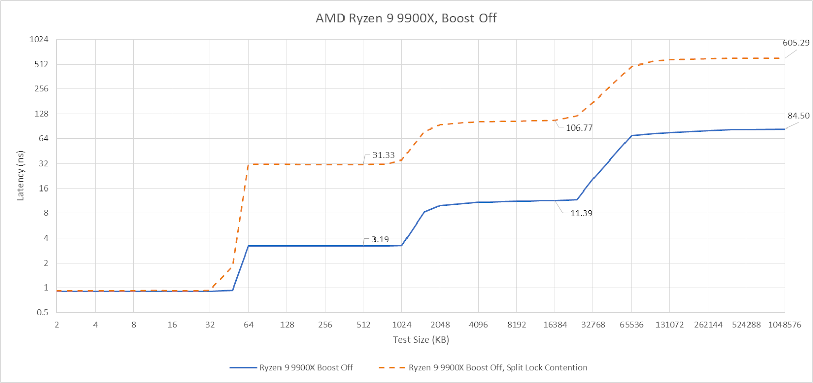 Curiously, L3 latency takes another hit after 2 MB if split locks are being looped on the same CCX. Zen 5 didn’t have an extra inflection point under split lock contention even within the same CCX.