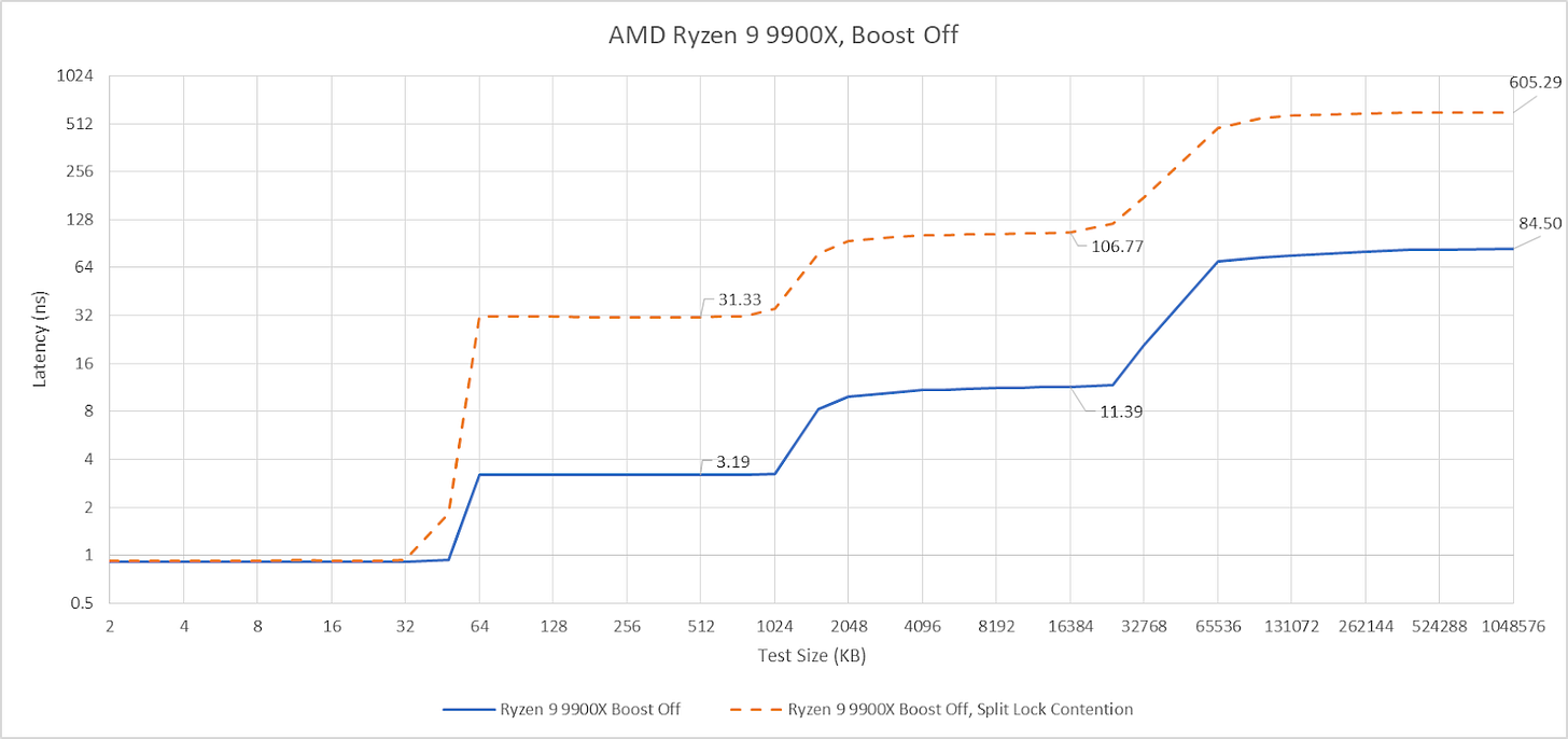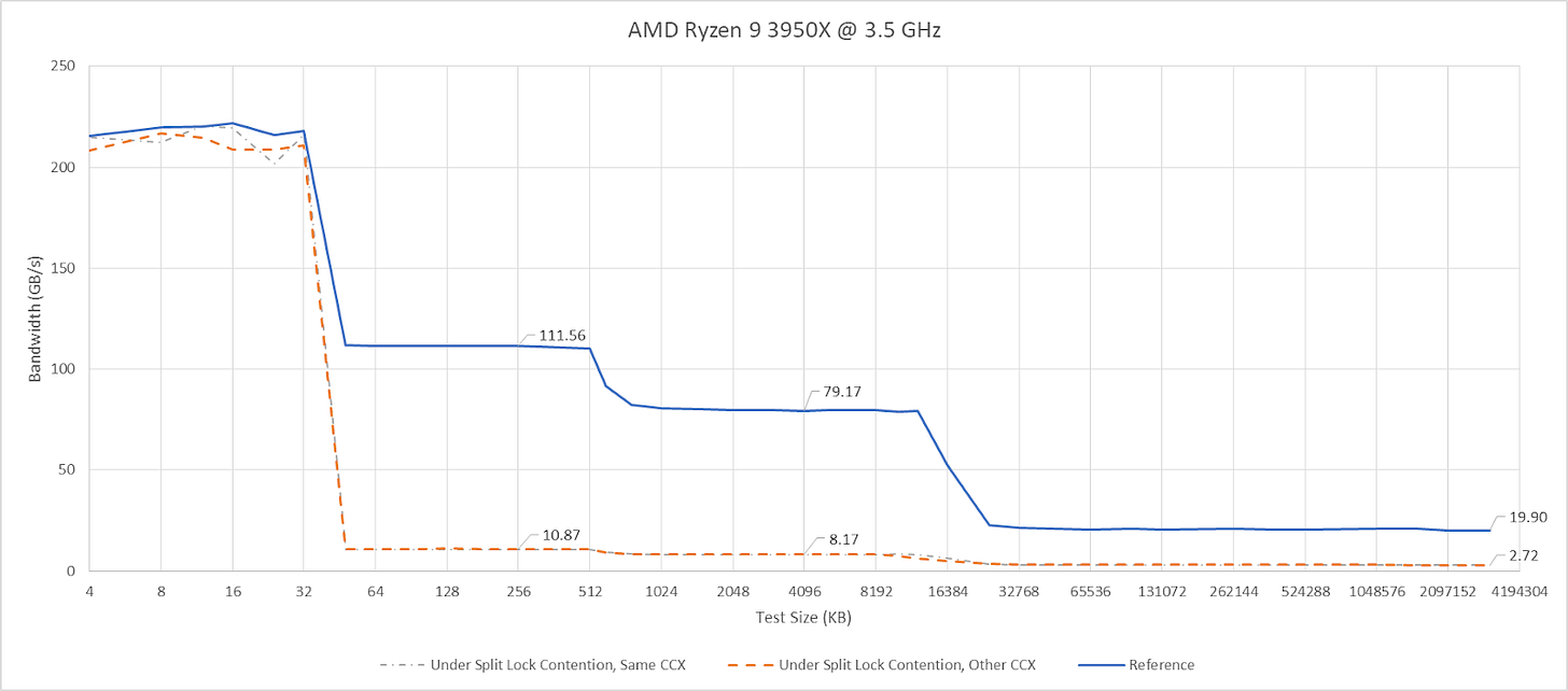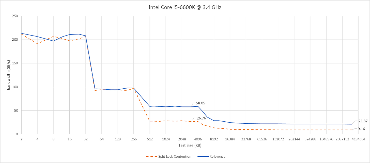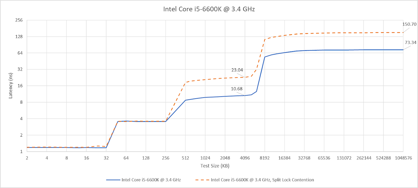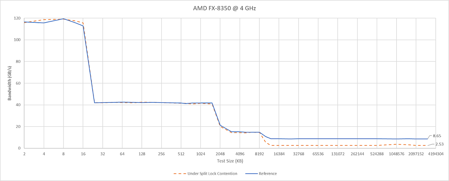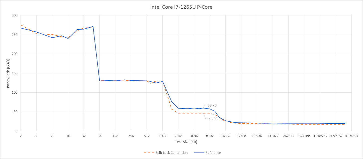 Split locks don’t affect cache hits. Remarkably, that extends to the shared L3 cache. DRAM performance does get hit, with latency doubled and bandwidth cut by more than half.