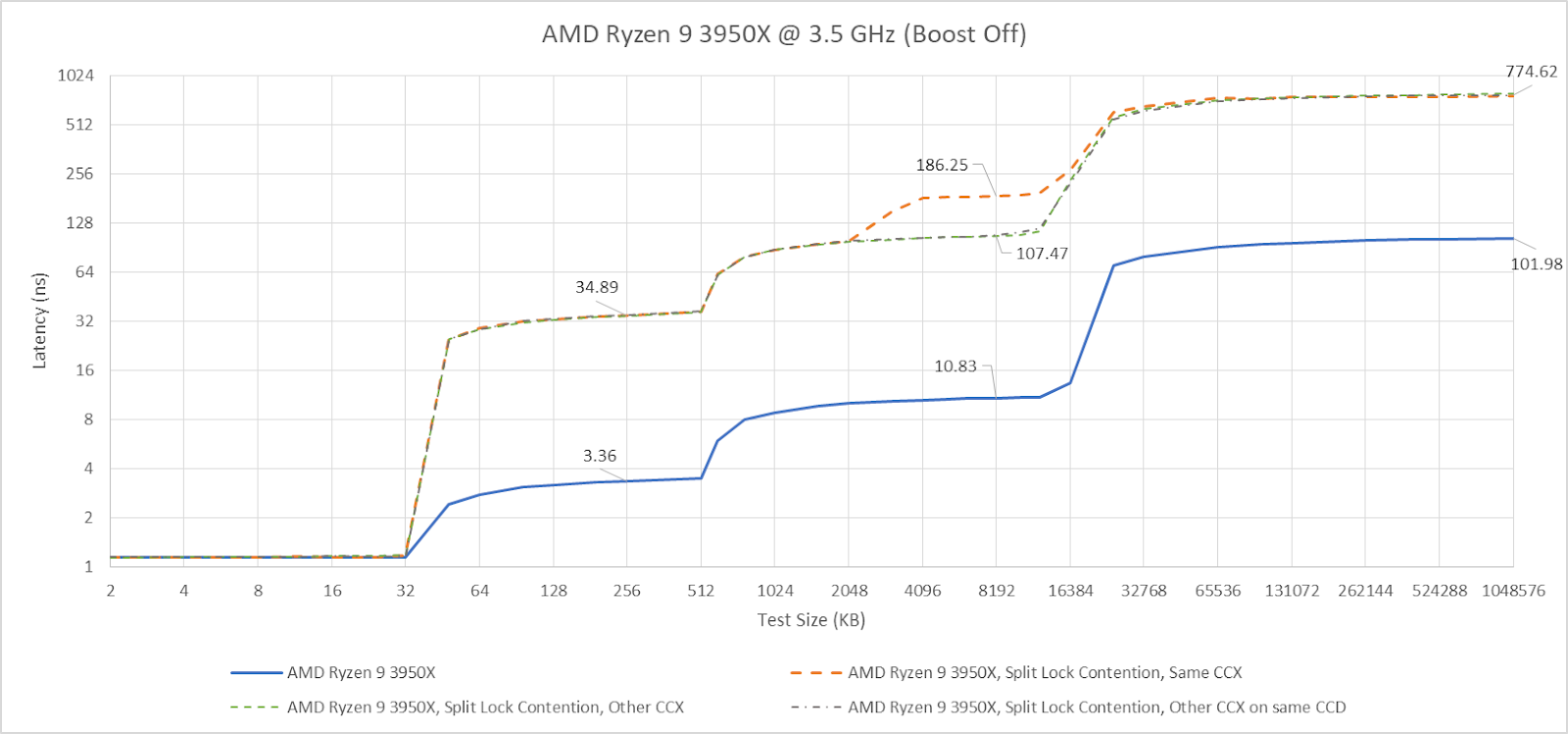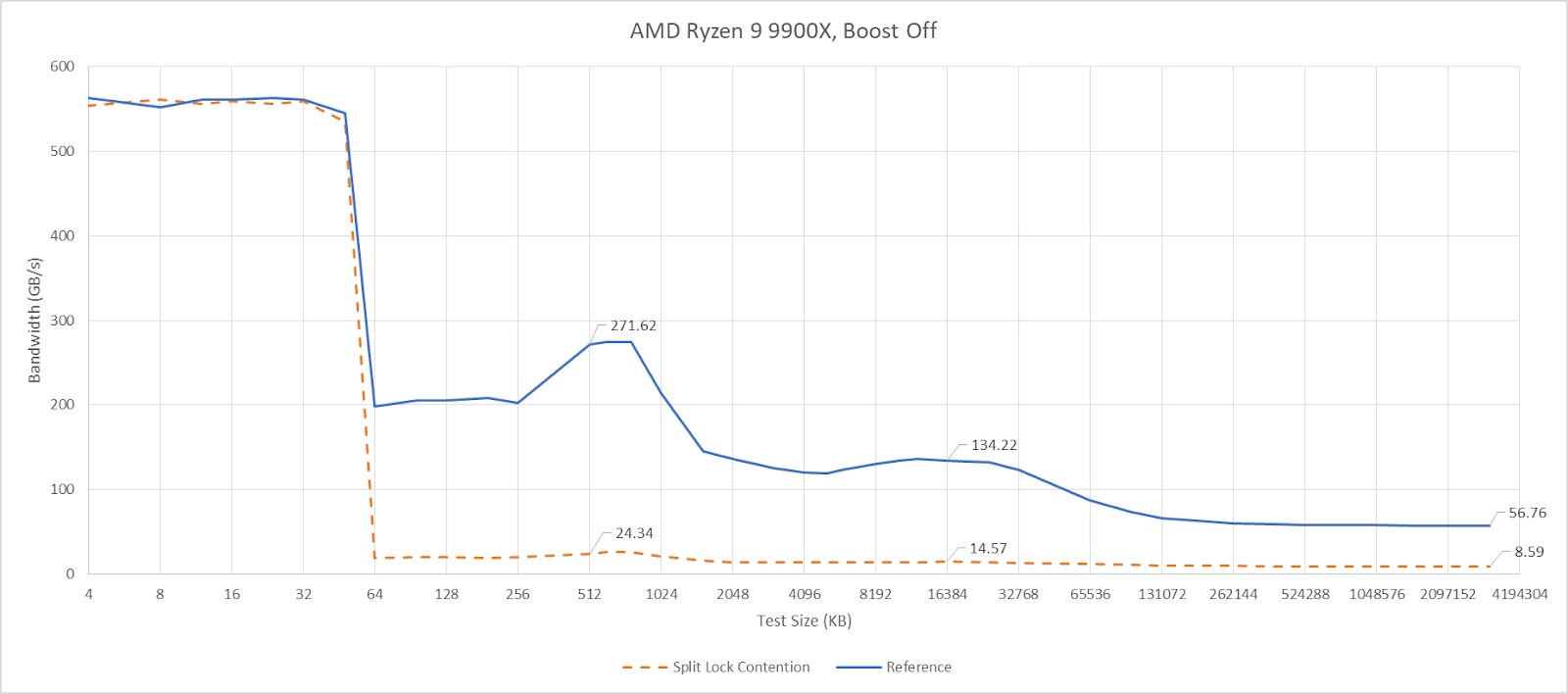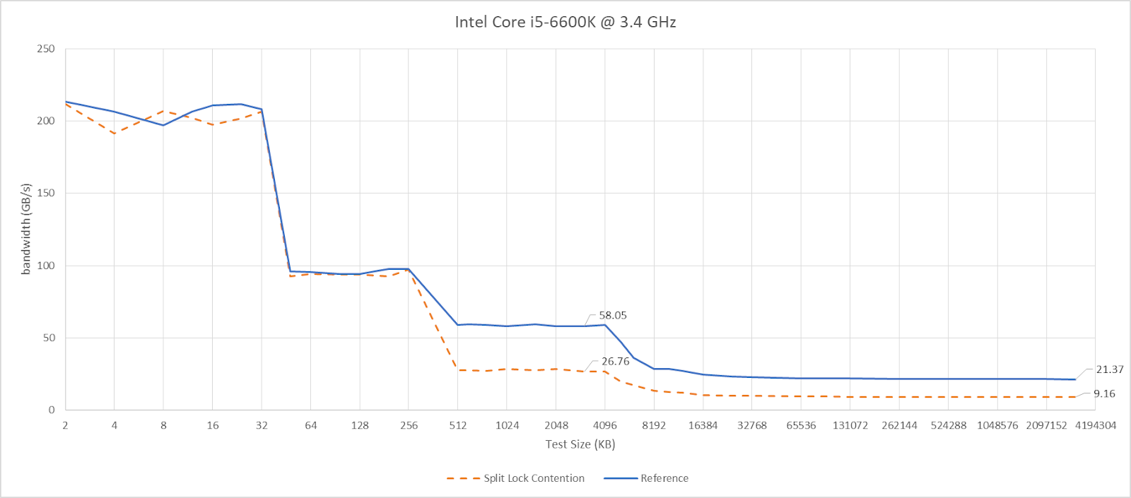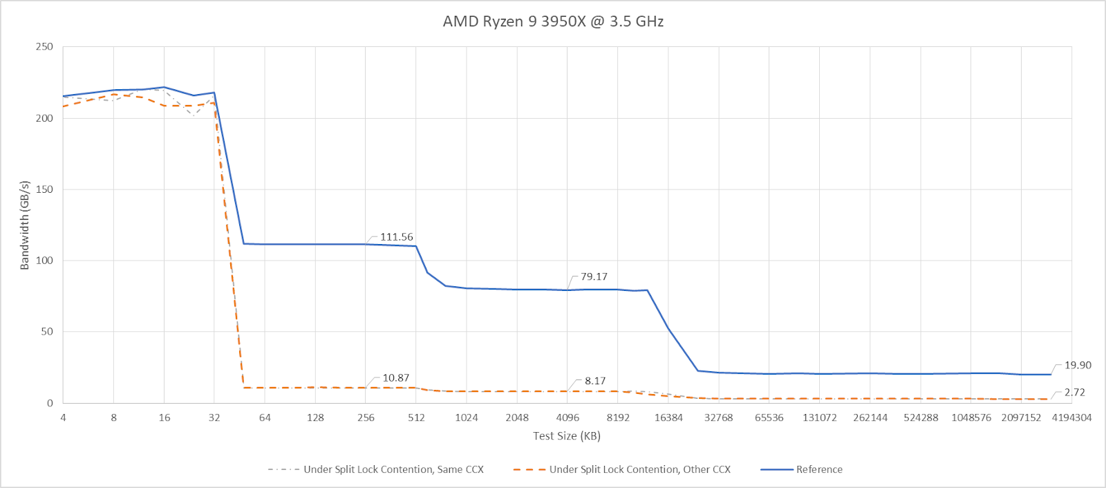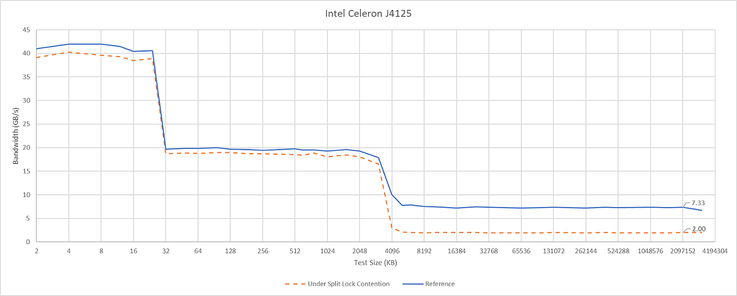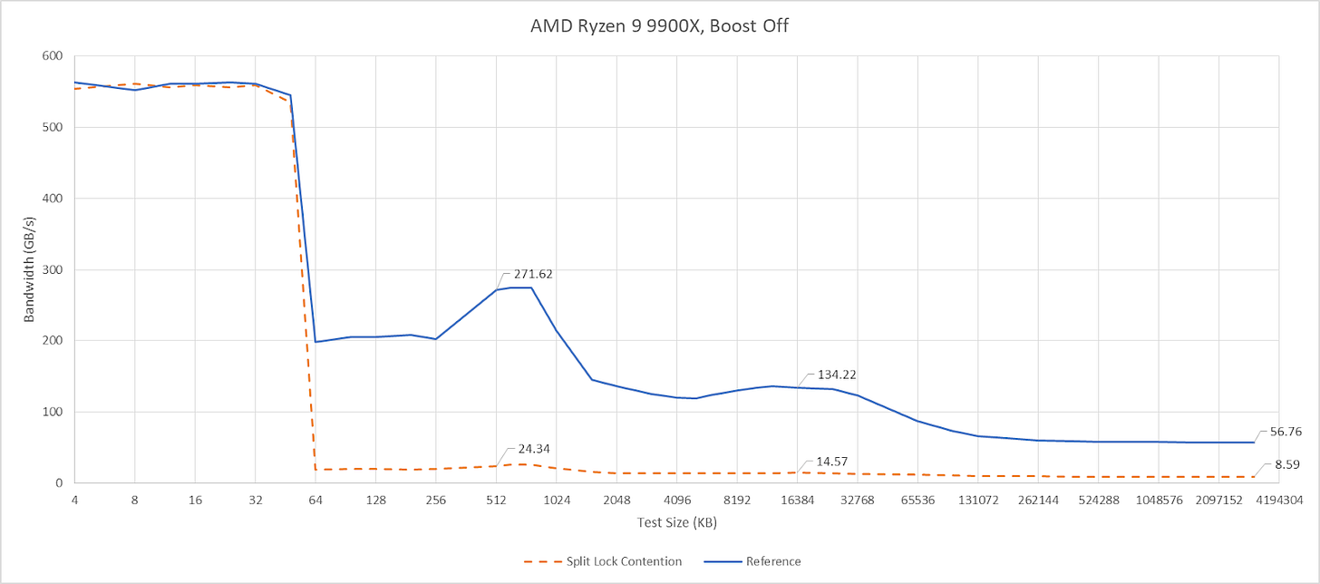 Split locks don’t affect cache hits. Remarkably, that extends to the shared L3 cache. DRAM performance does get hit, with latency doubled and bandwidth cut by more than half.