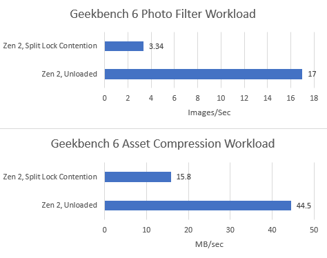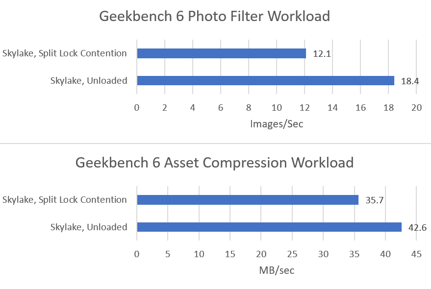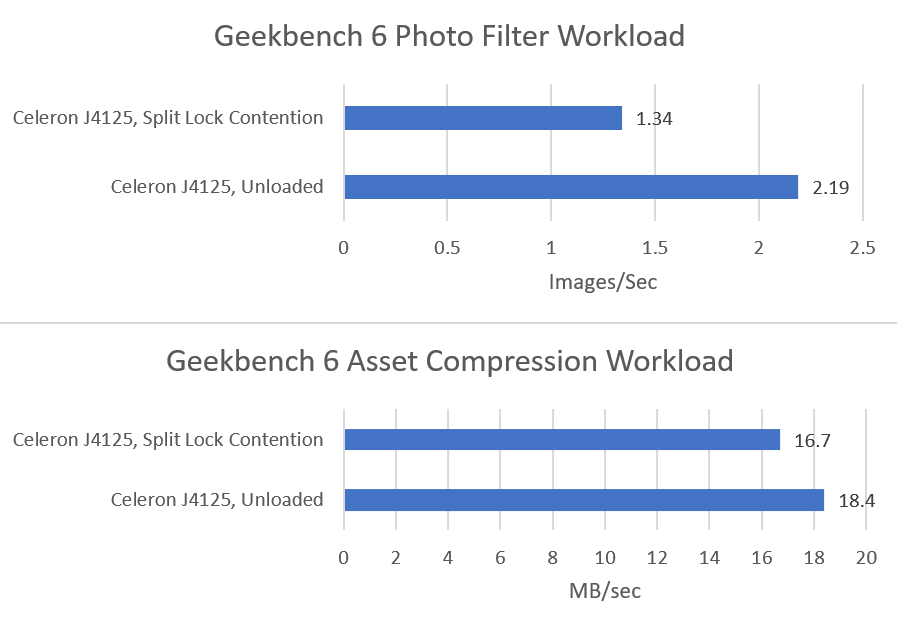 Both tested Geekbench 6 workloads show measurable performance impact from split locks. Photo filter loses 34.24% of its performance, while asset compression takes a lower 16.2% loss.