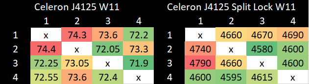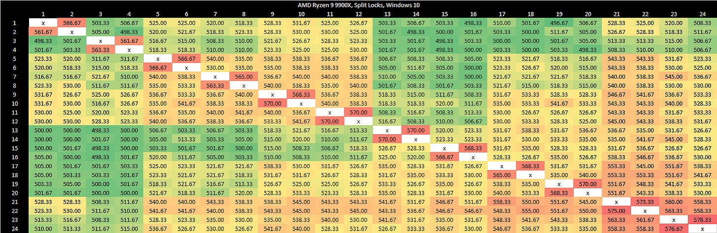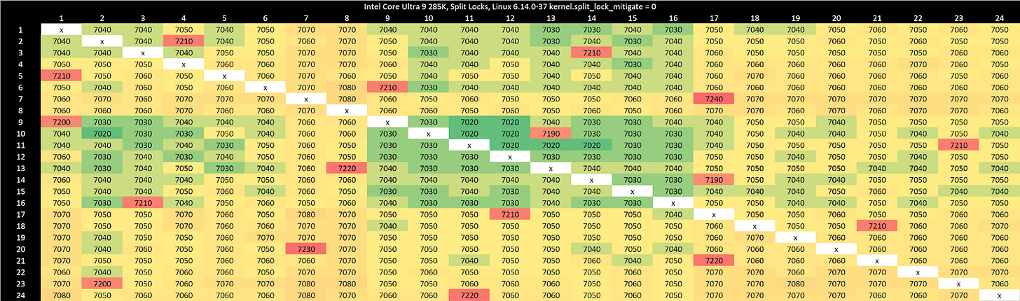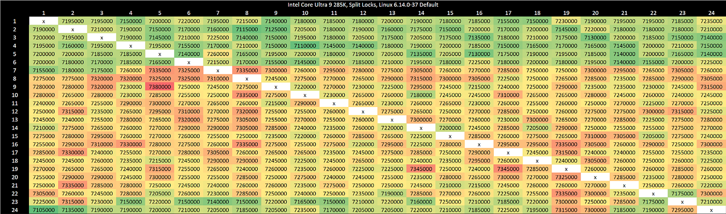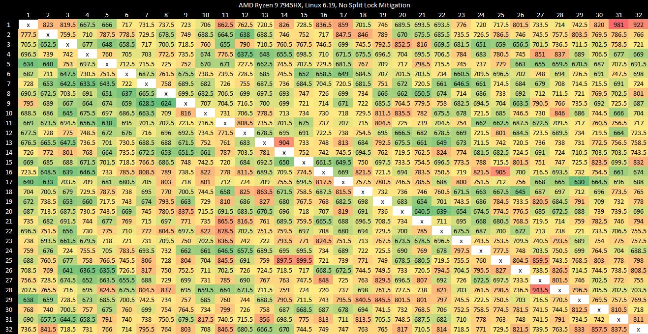 Testing on Linux without touching sysctl settings shows latency comparable to mechanical hard drive seek time, which is an eternity for a CPU. This kind of delay should also eliminate the noisy neighbor effects above, since the split lock core to core latency test simply isn’t running most of the time.