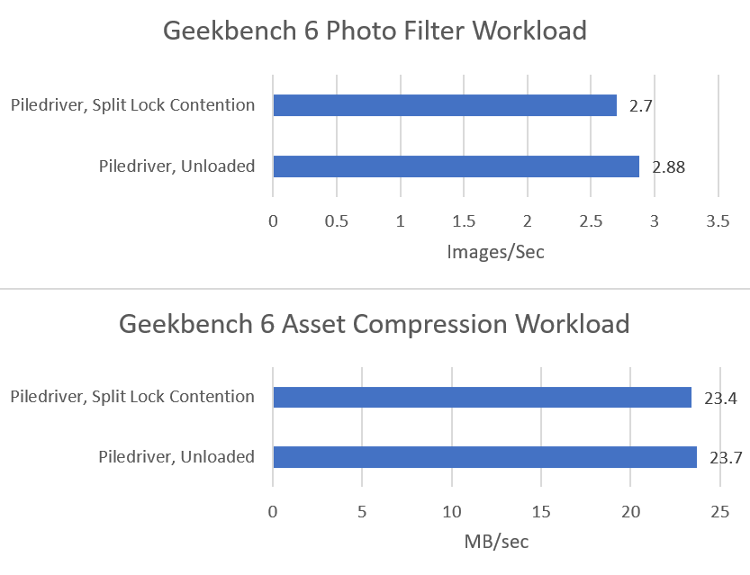 Microbenchmark results translate to higher level workloads. Geekbench 6’s photo filter and asset compression workloads both get away with only minor performance impact. The hit to DRAM performance certainly hurts, but a Piledriver core has 10 MB of cache completely unaffected by split locks. No other hardware tested here can field that much split-lock-unaffected cache capacity.
