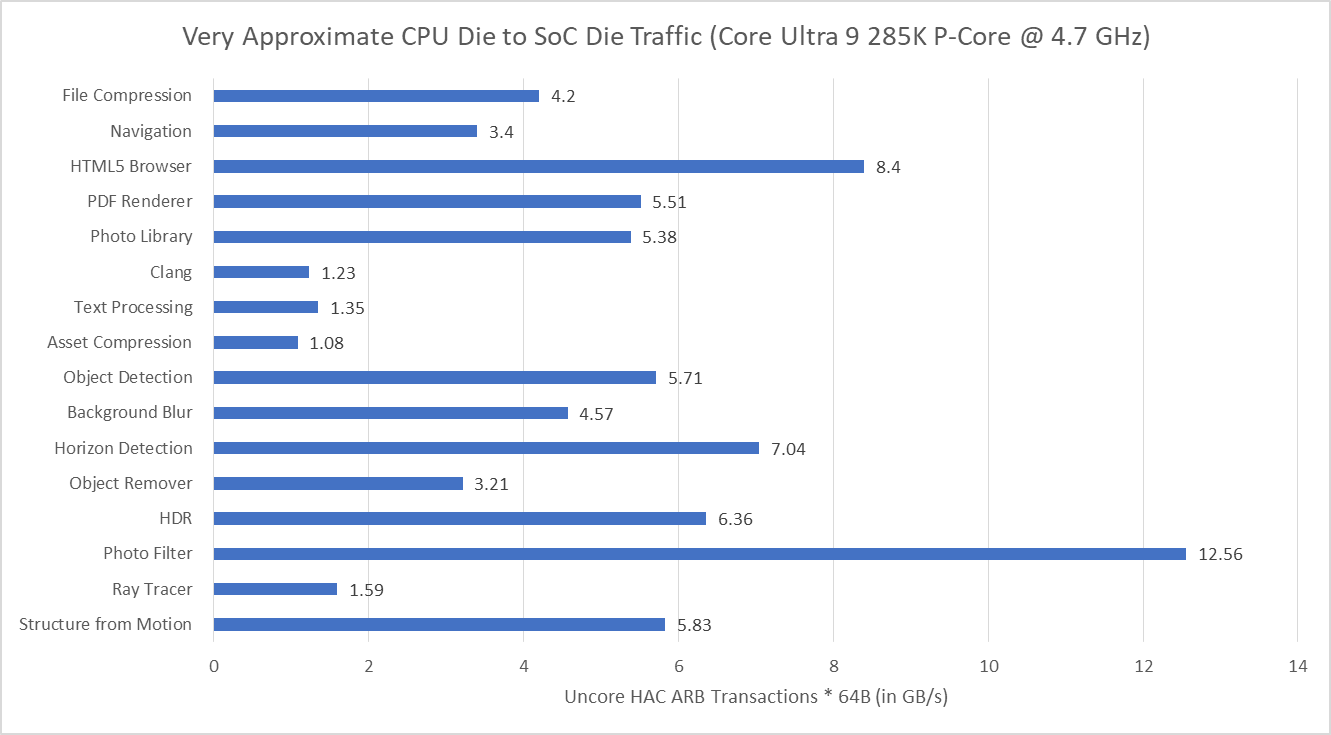 I took rough notes on die to die traffic when running Geekbench 6 workloads on Arrow Lake by observing performance counters sampled at 1 second interval and picking out spikes. My goal isn’t to give an accurate figure for average L3 miss traffic per workload, but rather to select two interesting workloads for measuring split lock impact.