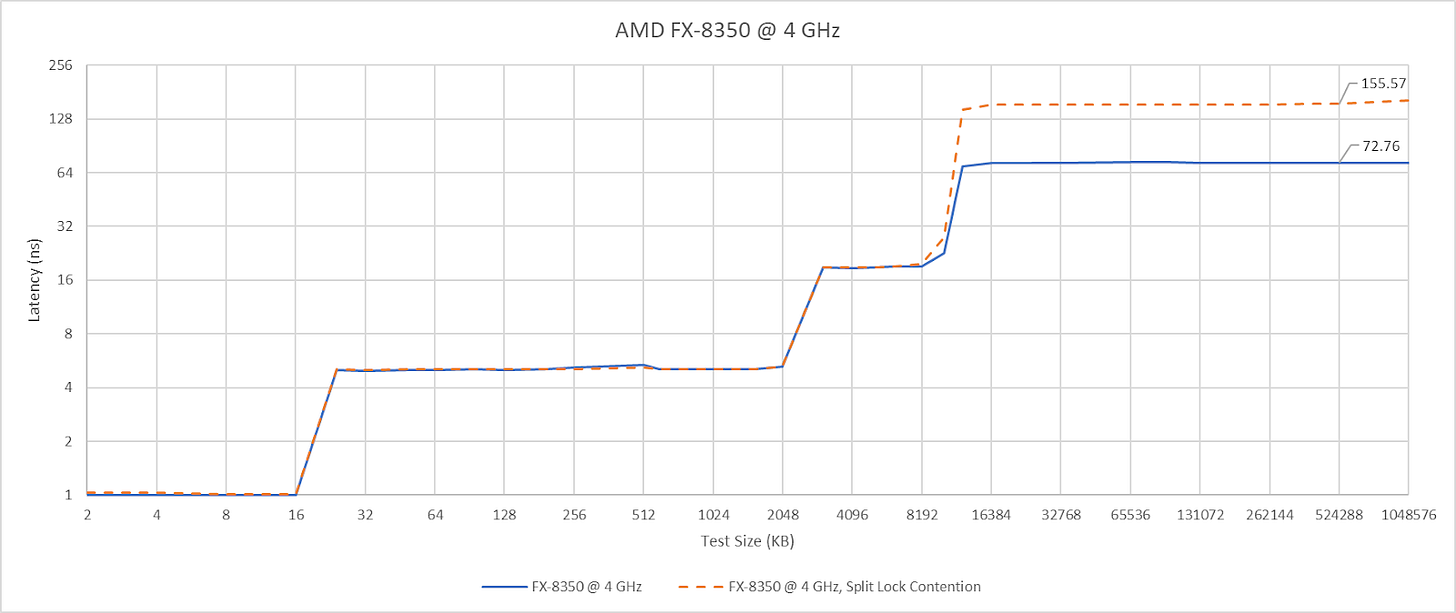 Piledriver also throws a wrench into the works when trying to define bus locks. Maybe AMD’s old architecture doesn’t use bus locks at all, and is able to use its cache coherency protocol to let unrelated accesses proceed as long as they hit cache.