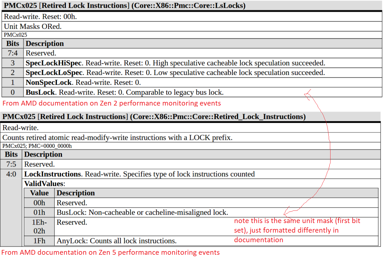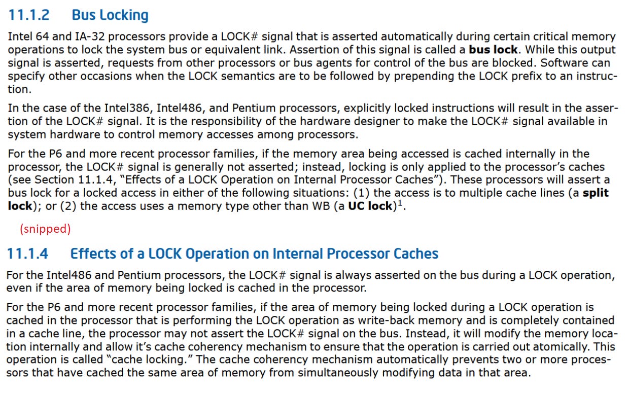 Bus locks are problematic because they’re slow, and taking a bus lock “potentially disrupts performance on other cores and brings the whole system to its knees”. AMD and Intel’s newer cores can trap split locks, letting the kernel easily detect processes that use split locks and potentially mitigate that noisy neighbor effect. Linux defaults to using this feature and inserting an artificial delay to mitigate the performance impact.