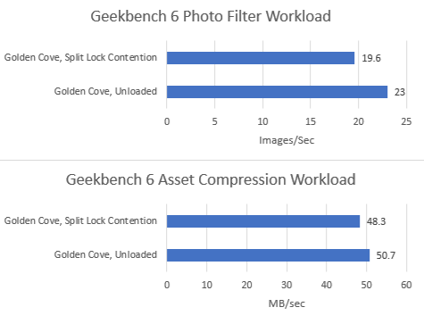 Geekbench 6’s photo filter and asset compression workloads barely show any performance loss, as foreshadowed by microbenchmark results. Alder Lake might have particularly poor split lock performance, but does an excellent job of insulating other applications from their effects.