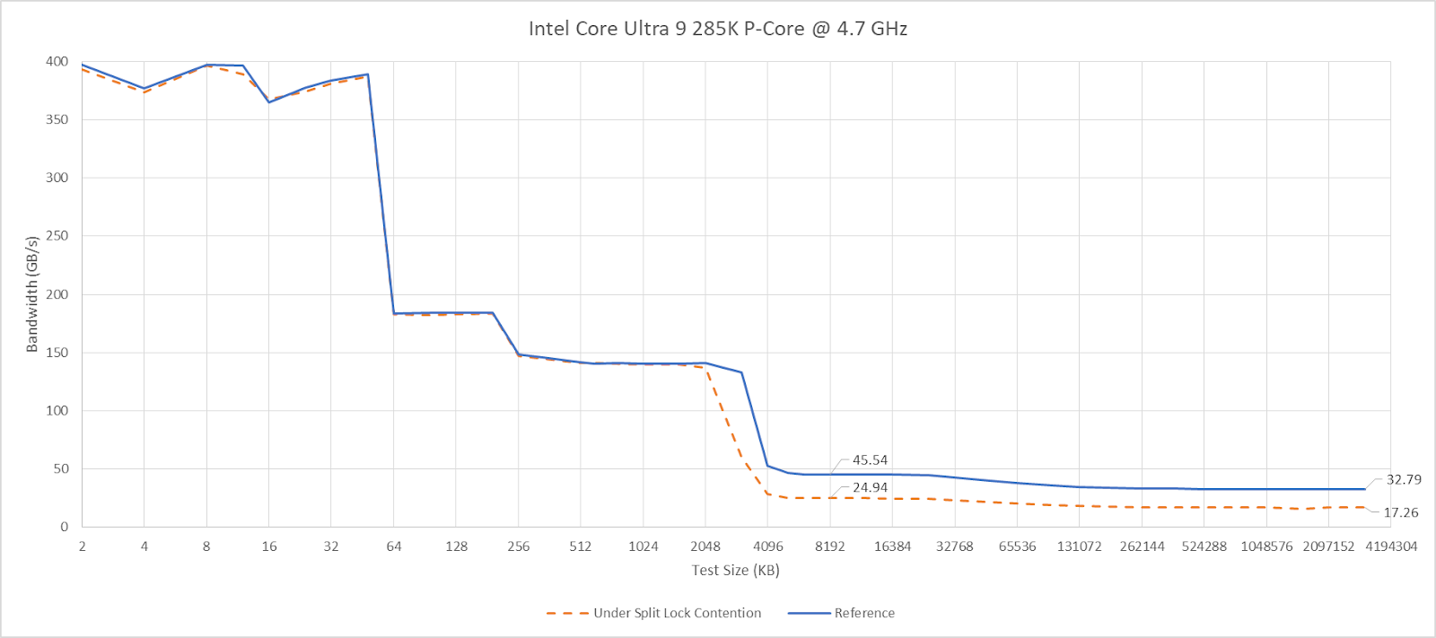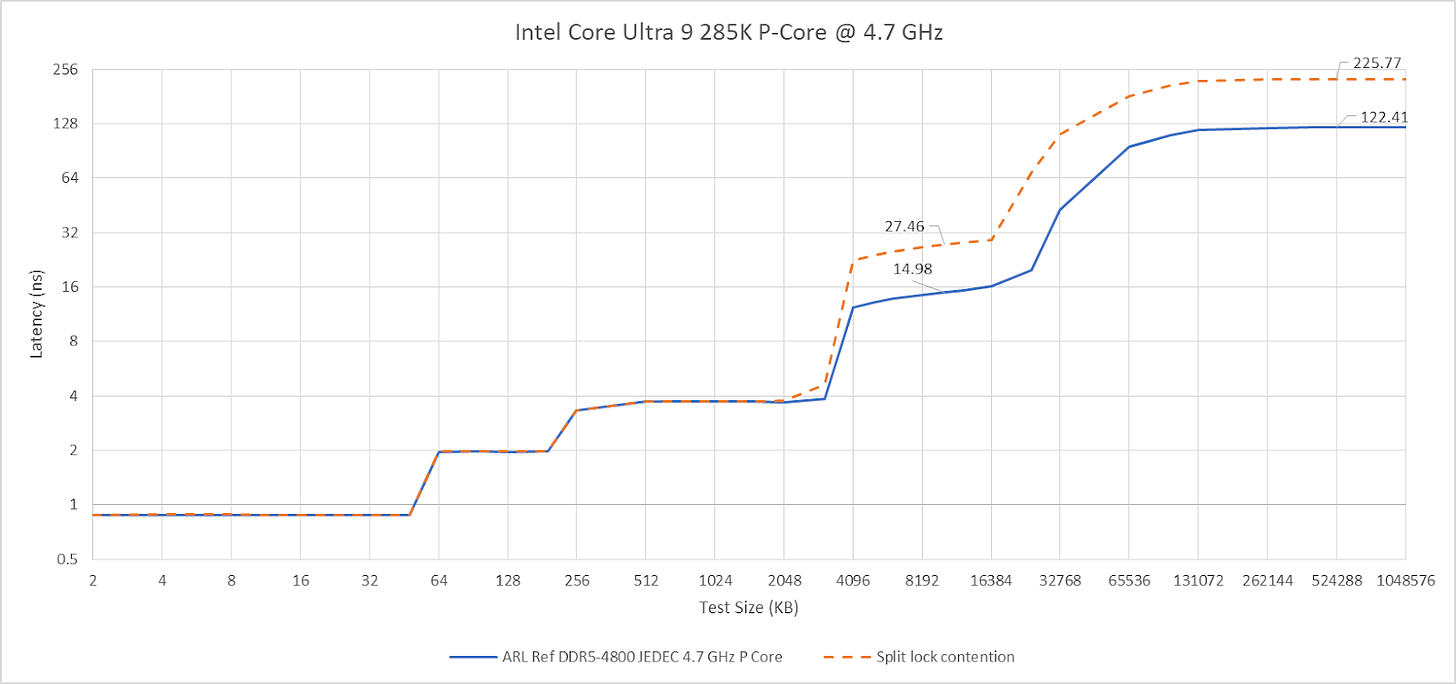 Past L2, split lock contention roughly halves memory access performance. Curiously, the 4 MB L2 caches shared across quad-core E-Core clusters aren’t affected, even if split locks are being looped from a pair of cores within the same cluster.
