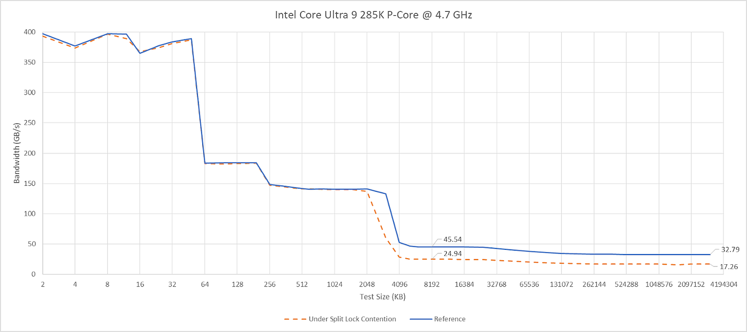 On Arrow Lake, split locks only affect L2 misses. It’s close to a “bus lock” in the traditional sense because it affects the first level in the memory hierarchy shared by all CPU cores. In theory a program can be completely unaffected by split locks as long as it keeps hitting in L2 or faster caches.