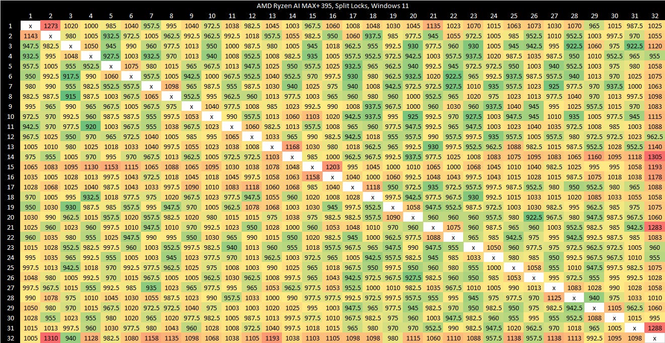 Zen 5 in the Ryzen AI MAX+ 395 (Strix Halo) has higher split lock latency than its desktop Zen 5 counterparts. I suspect split locks are handled at Infinity Fabric’s Coherent Station blocks, but curiously those counters also increment for intra-cacheline locks that are handled within a CCX. Perhaps the Coherent Station gets some sort of notification about a line changing state.
