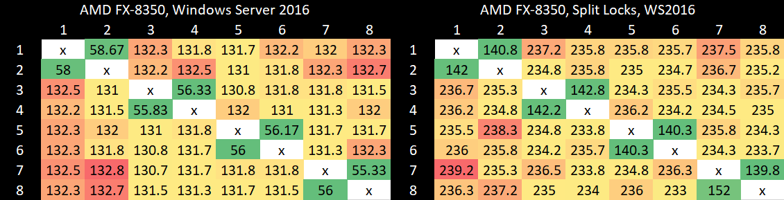 AMD’s Piledriver has high core to core latency results, but remarkably has the best results for split locks. Split lock latency is double to triple the latency of intra-cacheline locks, but that’s worlds better than on newer platforms.