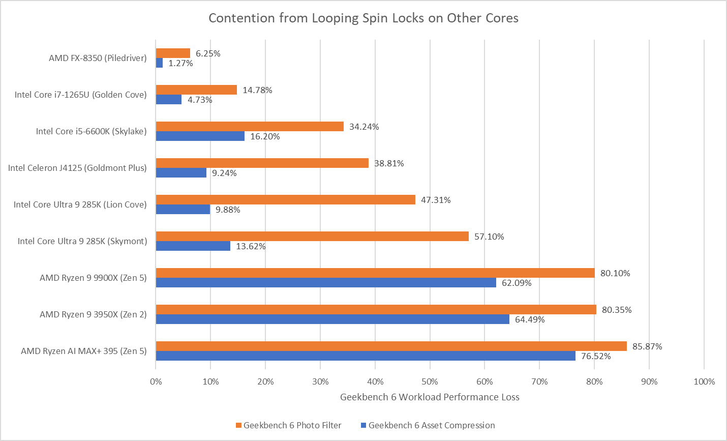 To assess the potential disruption from split locks, I ran memory latency and bandwidth microbenchmarks on cores excluded from the core to core latency test. Besides microbenchmarks, I ran Geekbench 6’s photo filter and asset compression workloads. The photo filter workload generates a lot of cache miss traffic, while asset compression tends to be the opposite. Many recent CPUs only achieve their highest clock speeds with two or fewer cores active. One core will be loaded by the workload being tested for contention effects, and another pair will be used for the core to core latency test. I therefore turned off boost or lowered clock speeds on some of the tested hardware to reduce noisy neighbor effects from clock speed variation, helping isolate the effects of split locks.