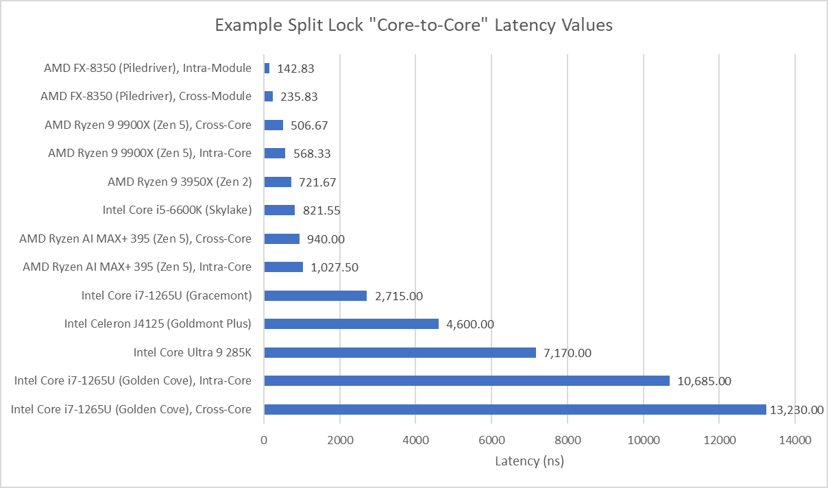 For consumer systems though, Linux’s default feels like an overreaction to a problem that didn’t exist. A core-to-core latency test uses locks at a rate no normal application would. A split lock variant of that test is even more ridiculous. Games have apparently been using split locks for quite a while, and have not created issues even on AMD’s Zen 2 and Zen 5. However, a game that runs at 10 FPS on Linux and 200 FPS on Windows is a problem for Linux.
