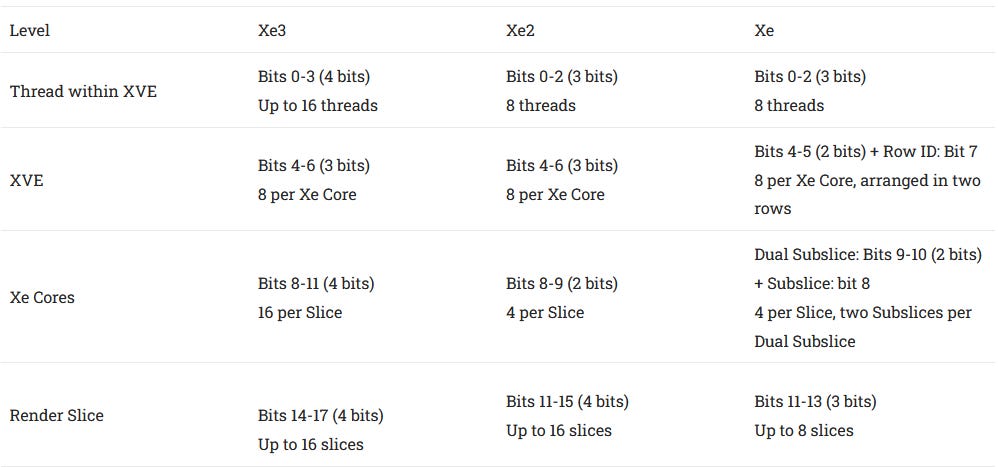 topology bits on Xe3 have a different layout1. Xe Cores within a Render Slice are enumerated with four bits, up from two in prior generations. Thus Xe3’s topology bits would be able to handle a Render Slice with up to 16 Xe Cores. Prior Xe generations could only have four Xe Cores per Render Slice, and often went right up to that. The B580 and A770 both placed four Xe Cores in each Render Slice.