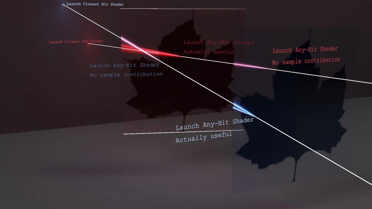 Sub-Triangle Opacity Culling (STOC) subdivides triangles in BVH leaf nodes, and marks sub-triangles as transparent, opaque, or partially transparent. The primary motivation is to reduce wasted any-hit shader work when games use texture alpha channels to handle complex geometry. Intel’s paper calls out foliage as an example, noting that programmers may use low vertex counts to reduce “rendering, animation, and even simulation run times.”7 BVH geometry from the API perspective can only be completely transparent or opaque, so games mark all partially transparent primitives as transparent. Each ray intersection will fire an any-hit shader, which carries out alpha testing. If alpha testing indicates the ray intersected a transparent part of the primitive, the shader program doesn’t contribute a sample and the any-hit shader launch is basically wasted. STOC bits let the any-hit shader skip alpha testing if the ray intersects a completely transparent or completely opaque sub-triangle.