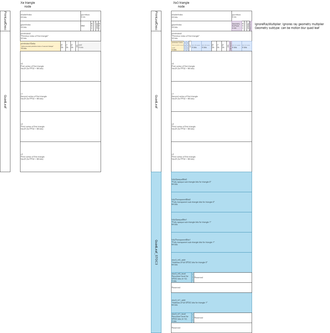 Xe3 brings STOC bits into hardware raytracing data structures with two levels of sophistication. A basic implementation retains 64B leaf nodes, but creatively finds space to fit 18 extra bits. Intel's QuadLeaf