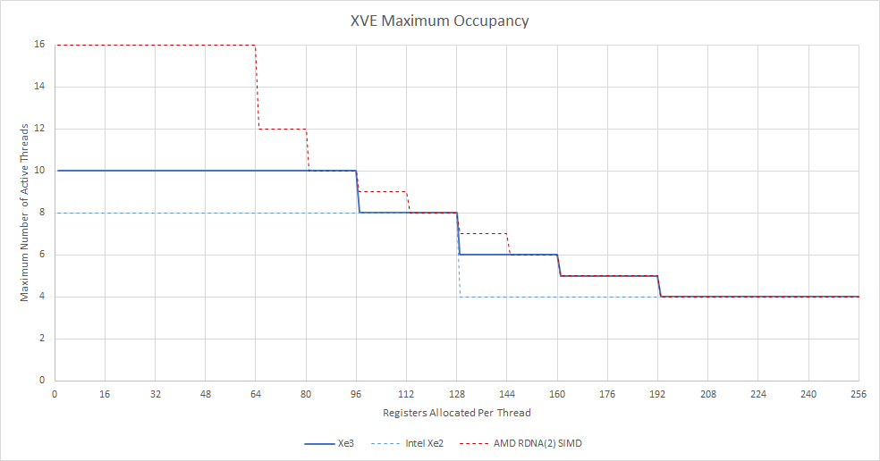 Prior Intel GPUs had two register allocation modes. Normally each thread gets 128 512-bit registers, for 8 KB of registers per thread. A “large GRF” mode gives each thread 256 registers, but drops occupancy to 4 threads because of register file capacity limits. Xe3 continues to use 64 KB register files per XVE, but flexibly allocates registers in 32 entry blocks2. That lets Xe3’s XVEs get 10 threads in flight as long as each thread uses 96 or fewer registers. If a shader program needs a lot of registers, occupancy degrades more gracefully than in prior generations.