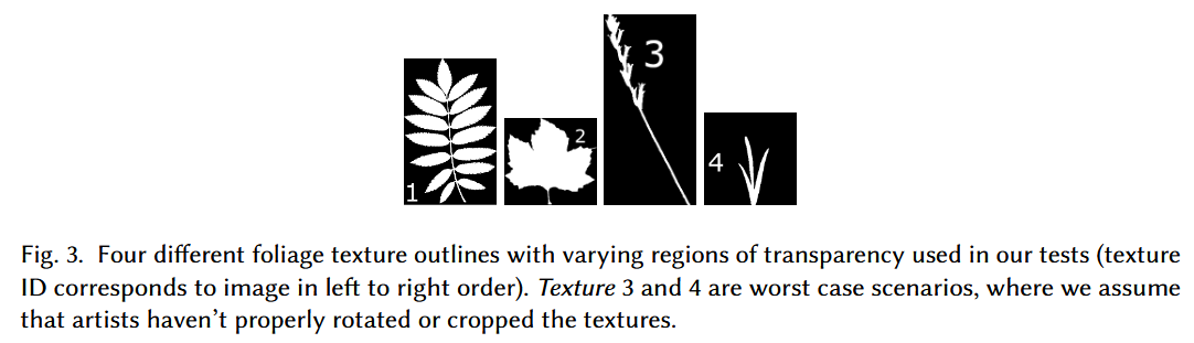 Storing each sub-triangle’s opacity information takes two bits, so STOC does require more storage compared to using a single opacity bit for the entire triangle. Still, it’s far more practical than packing entire textures into the BVH. Intel’s paper found that a software-only STOC implementation improved performance by 5.9-42.2% compared to standard alpha tests when handling translucent ray-traced shadows.