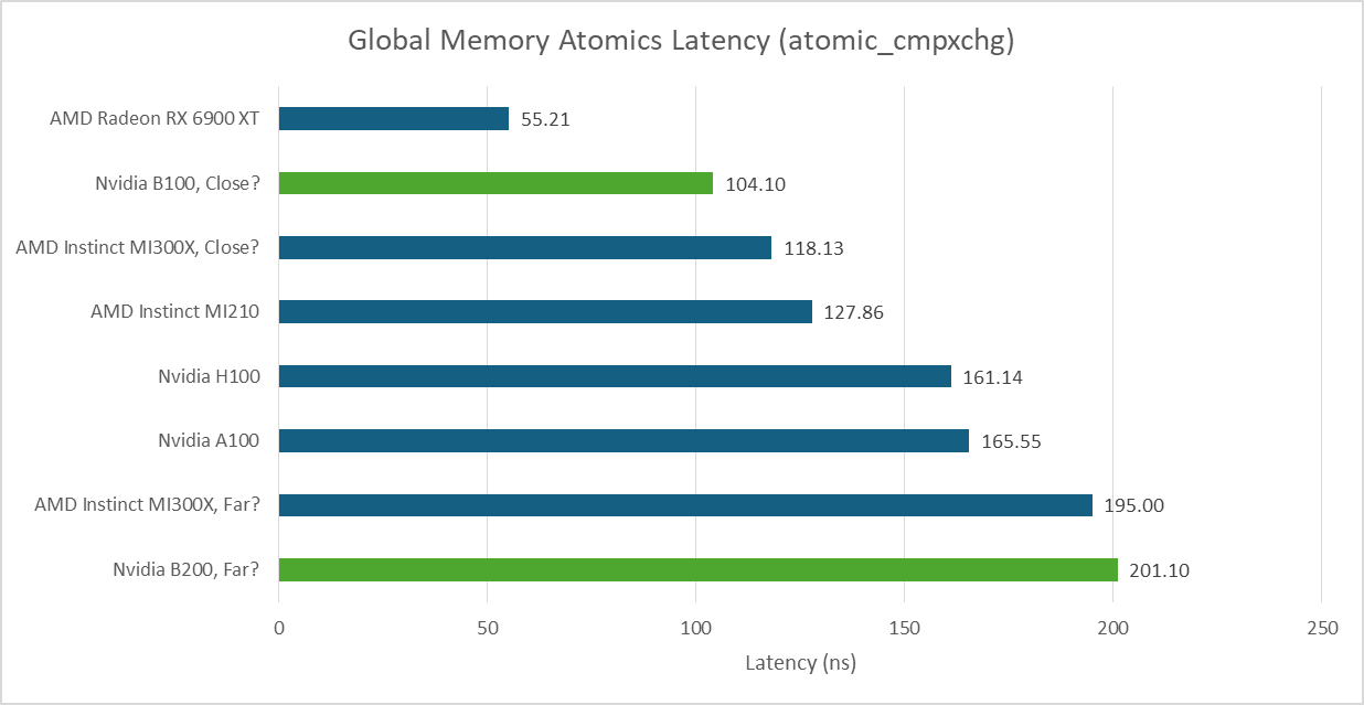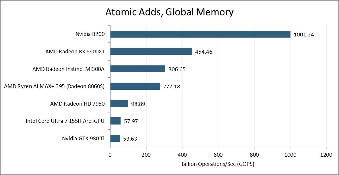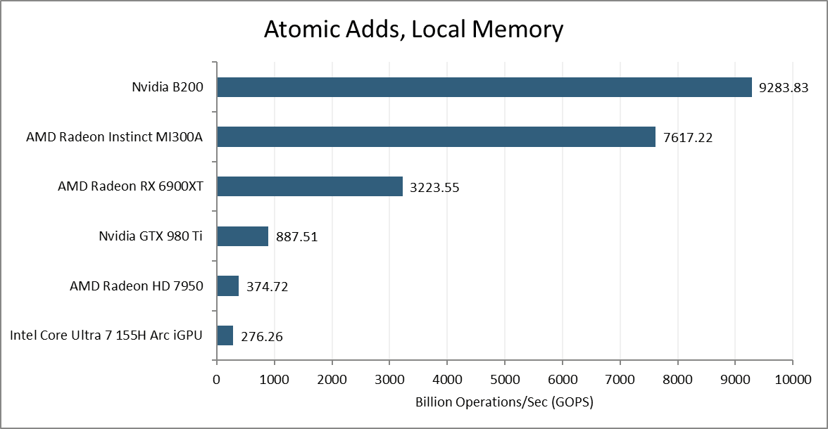 Atomic adds on global memory are usually handled by dedicated ALUs at a GPU-wide shared cache level. Nvidia’s B200 can sustain just short of 512 such operations per cycle across the GPU. AMD’s MI300A does poorly in this test, achieving lower throughput than the consumer oriented RX 6900XT.