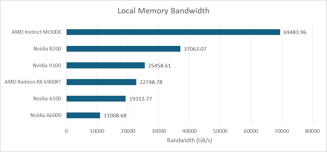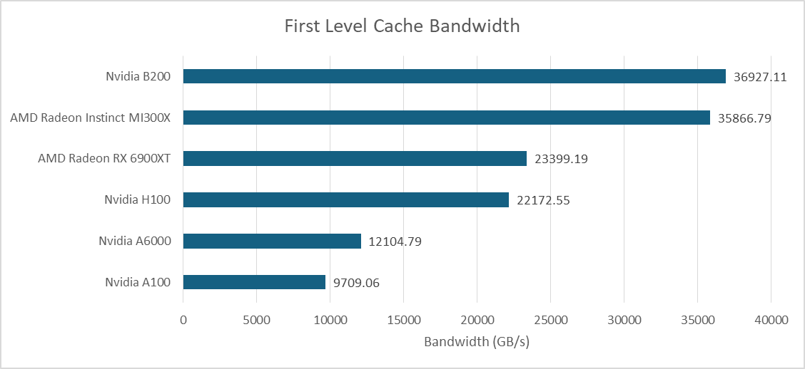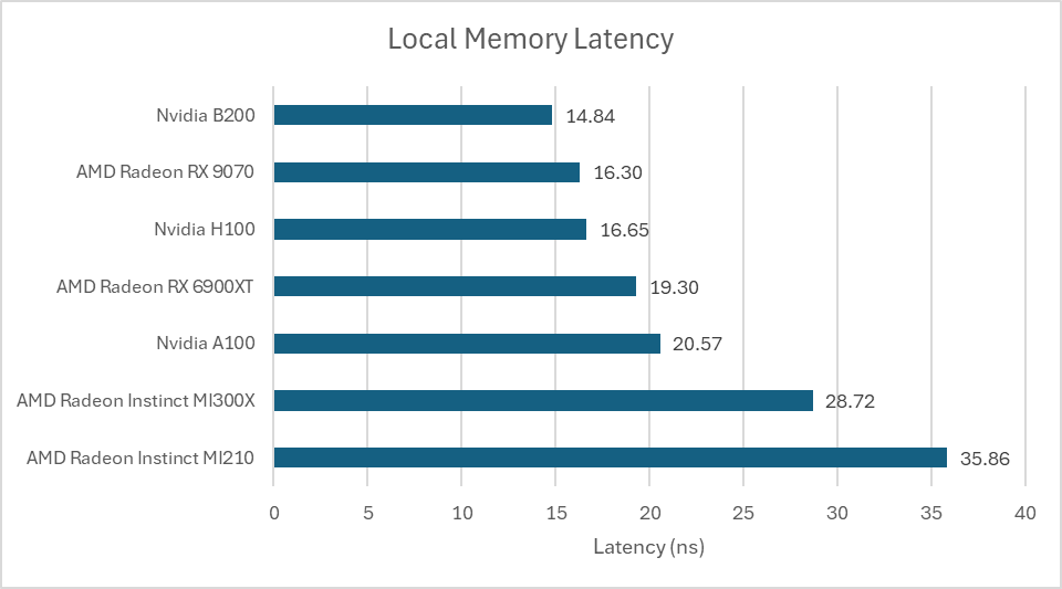 Local memory offers the same bandwidth as L1 cache hits on the B200, because both are backed by the same block of storage. That leaves AMD’s MI300X with a large bandwidth lead. Local memory is more difficult to take advantage of because developers must explicitly manage data movement, while a cache automatically takes advantage of locality. But it is an area where the huge MI300X continues to hold a lead.