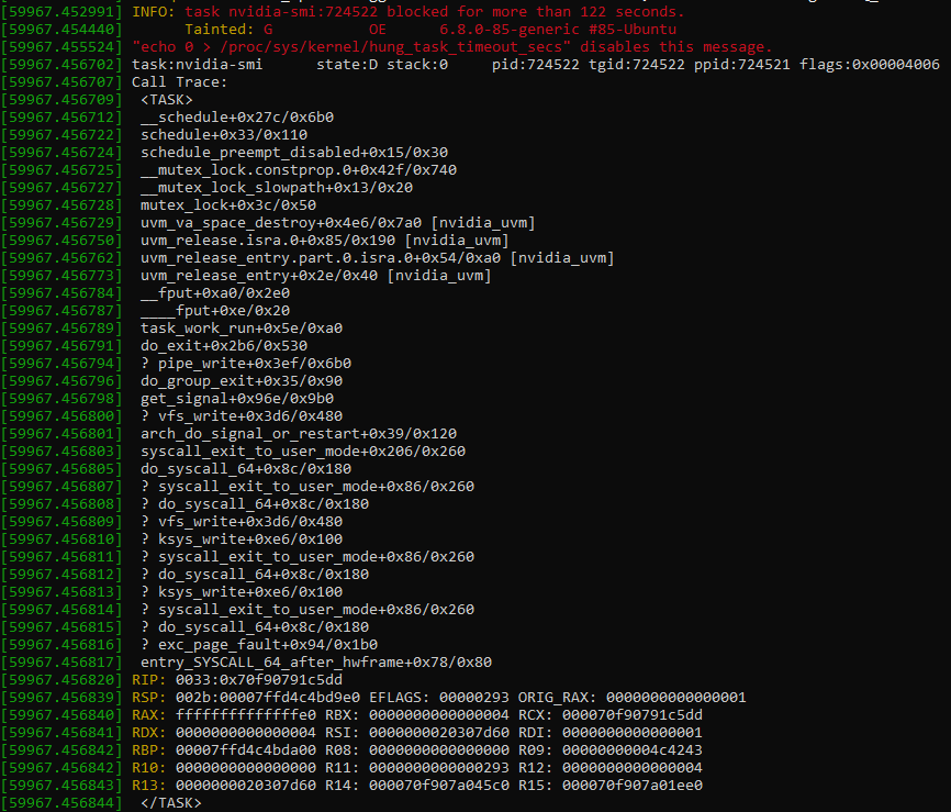 The stack trace suggests Nvidia might be trying to free allocated virtual memory, possibly on the GPU. Taking a lock makes sense because Nvidia probably doesn’t want other threads accessing a page freelist while it’s being modified. Why it never leaves the critical section is anyone’s guess. Perhaps it makes a request to the GPU and never gets a response. Or perhaps it’s purely a software deadlock bug on the host side.