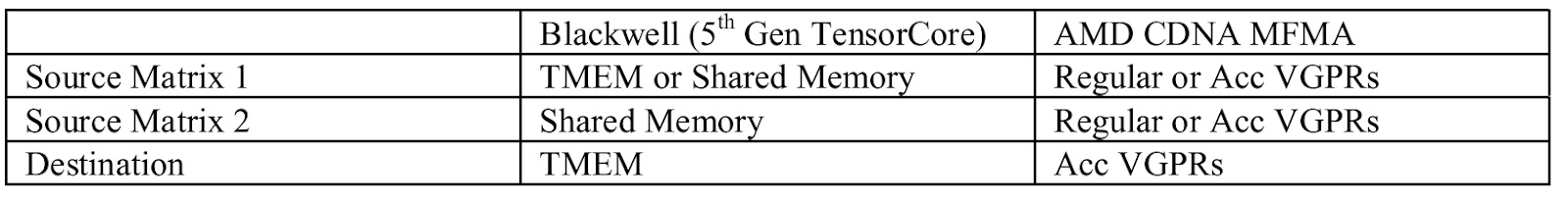 TMEM therefore works like the accumulator register file (Acc VGPRs) on AMD’s CDNA architecture. CDNA’s MFMA matrix instructions similarly operate on data in the Acc VGPRs, though MFMA can also take source matrices from regular VGPRs. On Blackwell, only the older wave-level matrix multiplication instructions take regular register inputs. Both TMEM and CDNA’s Acc VGPRs have 64 KB of capacity, giving both architectures a 64+64 KB split register file per execution unit partition. The regular vector execution units cannot take inputs from TMEM on Nvidia, or the Acc VGPRs on AMD.
