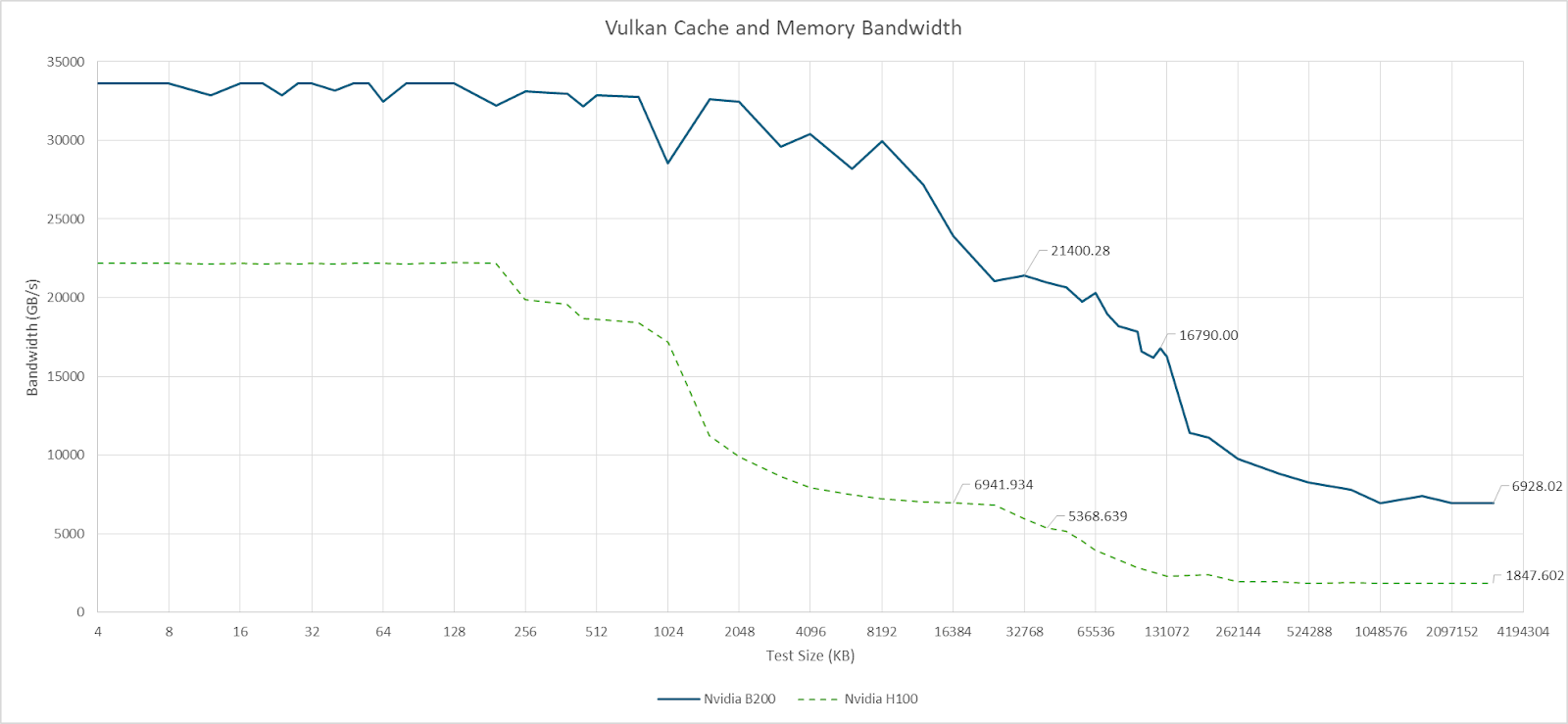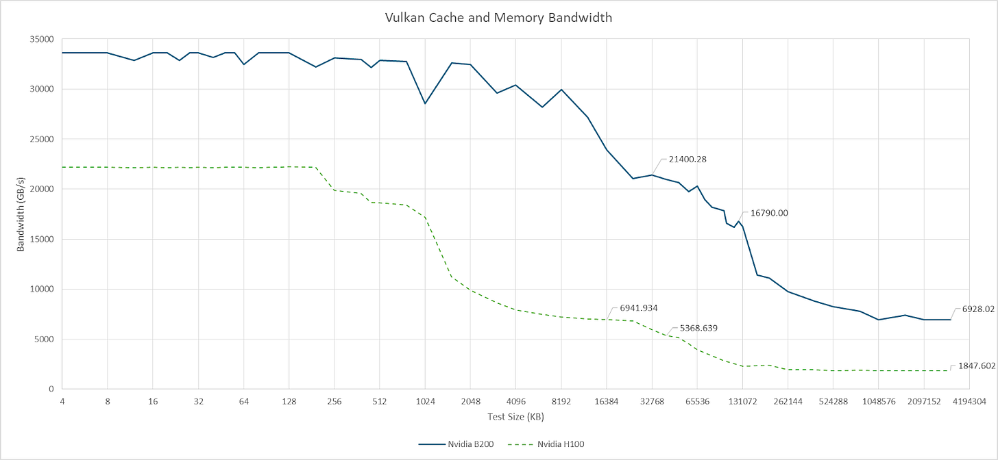 Nemez’s Vulkan-based benchmark provides an idea of what L2 bandwidth is like on the B200. Smaller data footprints contained within the local L2 partition achieve 21 TB/s of bandwidth. That drops to 16.8 TB/s when data starts crossing between the two partitions. AMD’s MI300X has no graphics API support and can’t run Vulkan compute. However, AMD has specified that the 256 MB Infinity Cache provides 14.7 TB/s of bandwidth. The MI300X doesn’t need the same degree of bandwidth from Infinity Cache because the 4 MB L2 instances in front of it should absorb a good chunk of L1 miss traffic.