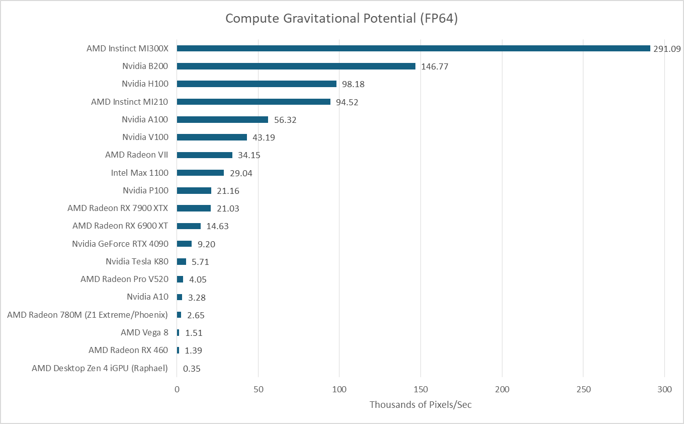 In the workload above, I take a 2360x2250 FITS file with column density values and output gravitational potential values with the same dimensions. The data footprint is therefore 85 MB. Even without performance counter data, it’s safe to assume it fits in the last level cache on both MI300X and B200.