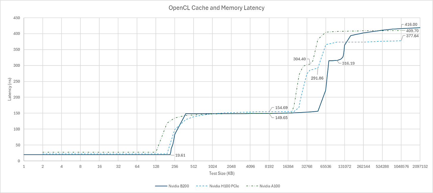 As with A100 and H100, B200 uses a partitioned L2 cache. However, it’s now much larger with 126 MB of total capacity. For perspective, H100 had 50 MB of L2, and A100 had 40 MB. L2 latency to the directly attached L2 partition is similar to prior generations at about 150 ns. Latency dramatically increases as test sizes spill into the other L2 partition. B200’s cross-partition penalty is higher than its predecessors, but only slightly so. L2 partitions on B200 almost certainly correspond to its two dies. If so, the cross-die latency penalty is small, and outweighed by a single L2 partition having more capacity than H100’s entire L2.