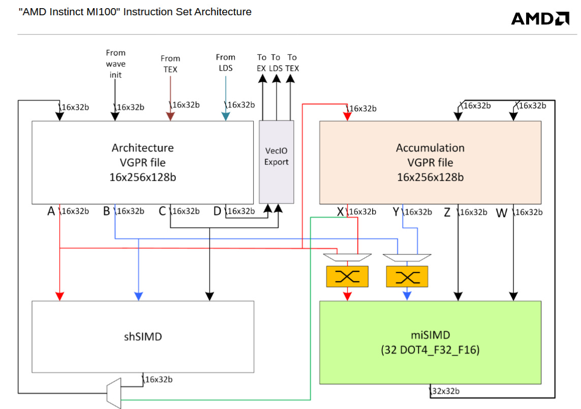 On AMD’s side, CDNA2 abandoned dedicated Acc VGPRs and merged all of the VGPRs into a unified 128 KB pool. Going for a larger unified pool of registers can benefit a wider range of applications, at the cost of not allowing certain hardware simplifications.