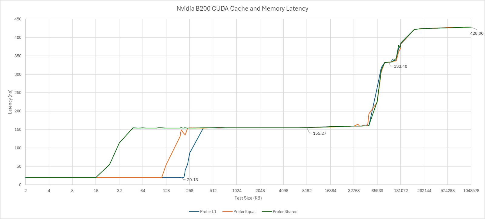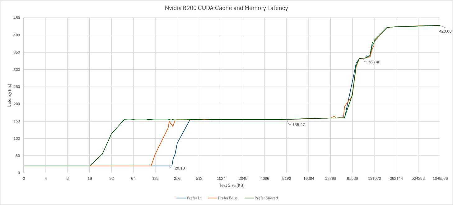 B200’s cache hierarchy feels immediately familiar coming from the H100 and A100. L1 and Shared Memory are allocated out of the same SM-private pool. L1/Shared Memory capacity is unchanged from H100 and stays at 256 KB. Possible L1/Shared Memory splits have not changed either. Shared Memory is analogous to AMD’s Local Data Share (LDS) or Intel’s Shared Local Memory (SLM), and provides software managed on-chip storage local to a group of threads. Through Nvidia’s CUDA API, developers can advise on whether to prefer a larger L1 allocation, prefer equal, or prefer more Shared Memory. Those options appear to give 216, 112, and 16 KB of L1 cache capacity, respectively.