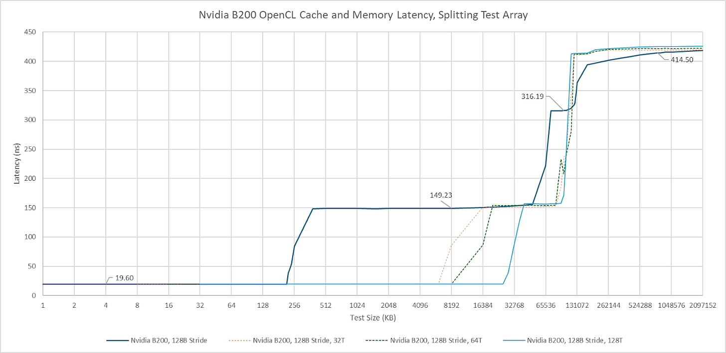 B200 acts like it has a triple level cache setup from a single thread’s perspective. The L2’s partitioned nature can be shown by segmenting the pointer chasing array and having different threads traverse each segment. Curiously, I need a large number of threads before I can access most of the 126 MB capacity without incurring cross-partition penalties. Perhaps Nvidia’s scheduler tries to fill one partition’s SMs before going to the other.
