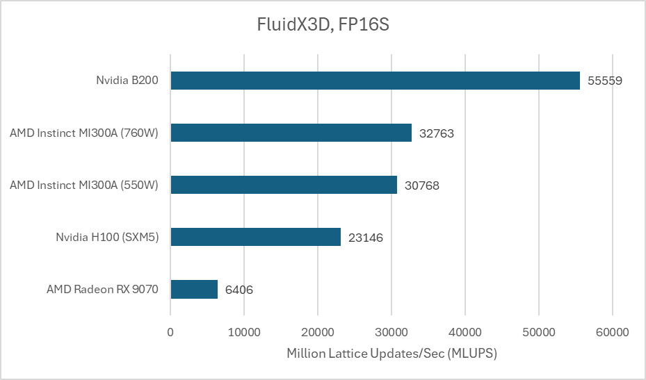 FluidX3D is a different matter. Its benchmark uses a 256x256x256 cell configuration and 93 bytes per cell in FP32 mode, for a 1.5 GB memory footprint. Its access patterns aren’t cache friendly, based on testing with performance counters on Strix Halo. FluidX3D plays well into B200’s VRAM bandwidth advantage, and the B200 now pulls ahead of the MI300X.