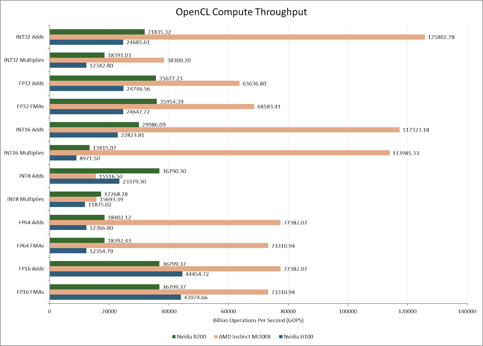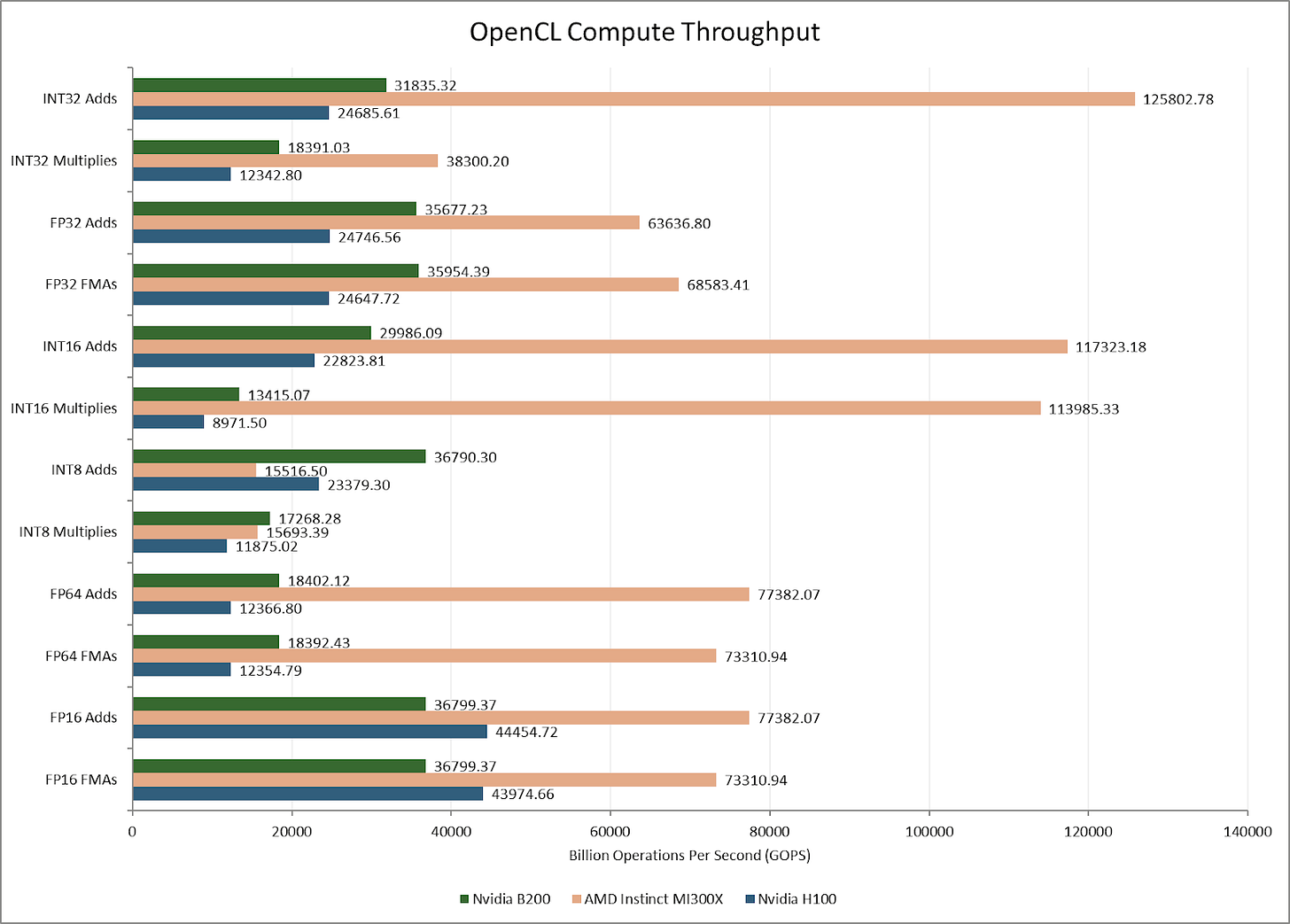 AMD’s MI300X can also do double rate FP16 compute. Likely, Nvidia decided to focus on handling FP16 with the Tensor Cores, or matrix multiplication units. Stepping back, the MI300X’s massive scale blows out both the H100 and B200 for most vector operations. Despite using older process nodes, AMD’s aggressive chiplet setup still holds advantages.