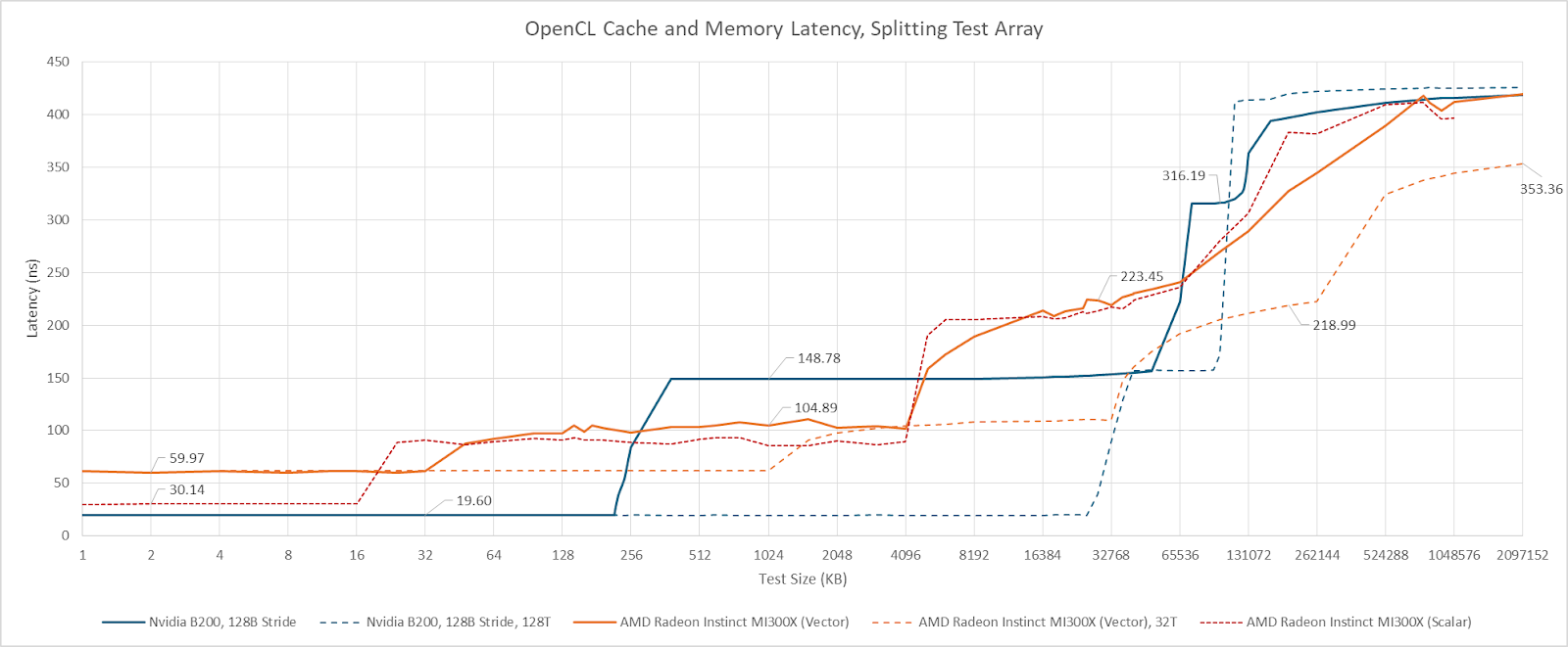 AMD’s Radeon Instinct MI300X has a true triple-level cache setup, which trades blows with B200’s. Nvidia has larger and faster L1 caches. AMD’s L2 trades capacity for a latency advantage compared to Nvidia. Finally, AMD’s 256 MB last level cache offers an impressive combination of latency and high capacity. Latency is lower than Nvidia’s “far” L2 partition.