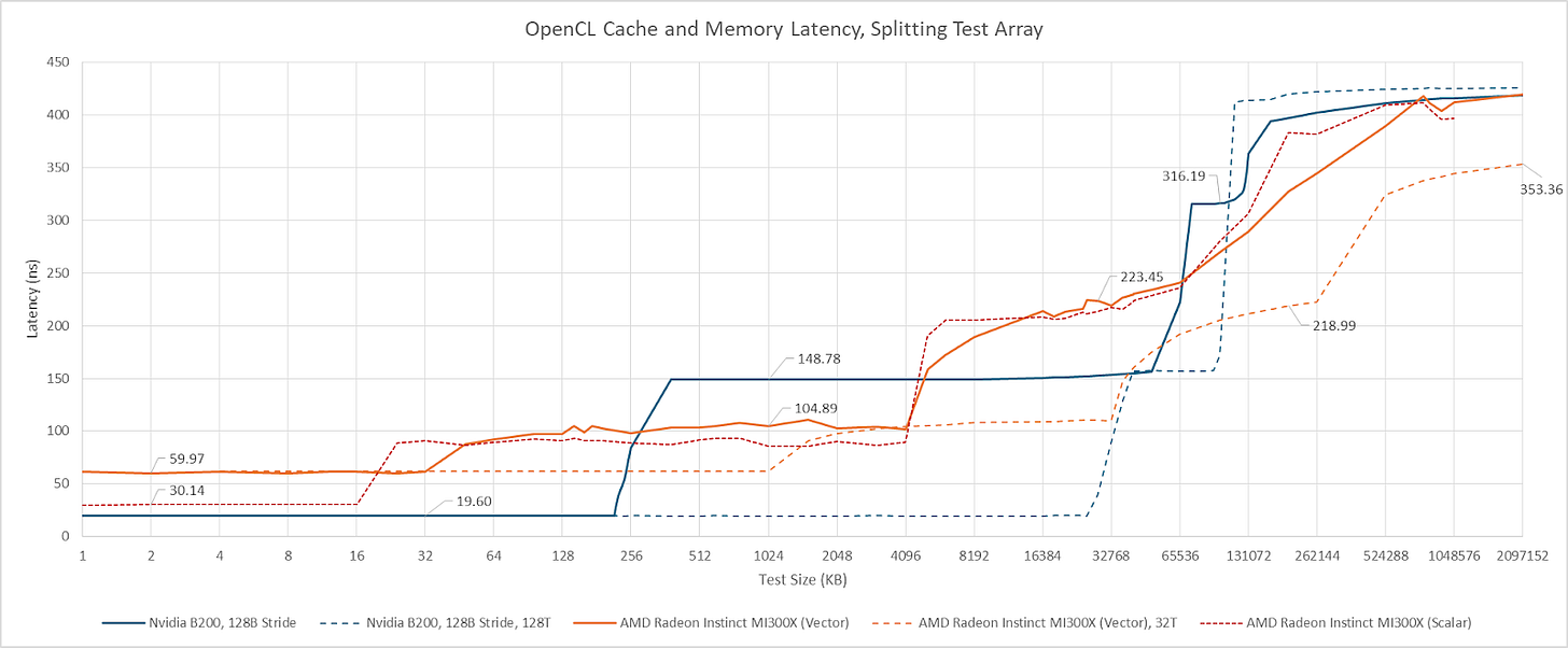 One curiosity is that both the MI300X and B200 show more uniform latency across the last level cache when I run multiple threads hitting a segmented pointer chasing array. However, the reasons behind that latency increase are different. The latency increase past 64 MB on AMD appears to be caused by TLB misses, because testing with a 4 KB stride shows a latency increase at the same point. Launching more threads brings more TLB instances into play, mitigating address translation penalties. Cutting out TLB miss penalties also lowers measured VRAM latency on the MI300X. On B200, splitting the array didn’t lower measured VRAM latency, suggesting TLB misses either weren’t a significant factor with a single thread, or bringing on more threads didn’t reduce TLB misses. B200 thus appears to have higher VRAM latency than the MI300X, as well as the older H100 and A100. Just as with the L2 cross-partition penalty, the modest nature of the latency regression versus H100/A100 suggests Nvidia’s multi-die design is working well.