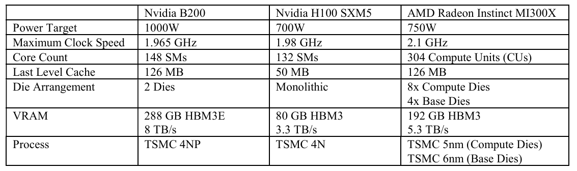 The B200 offers a large bandwidth advantage over the outgoing H100 at all levels of the cache hierarchy. Thanks to HBM3E, B200 also gains a VRAM bandwidth lead over the MI300X. While the MI300X also has eight HBM stacks, it uses older HBM3 and tops out at 5.3 TB/s.