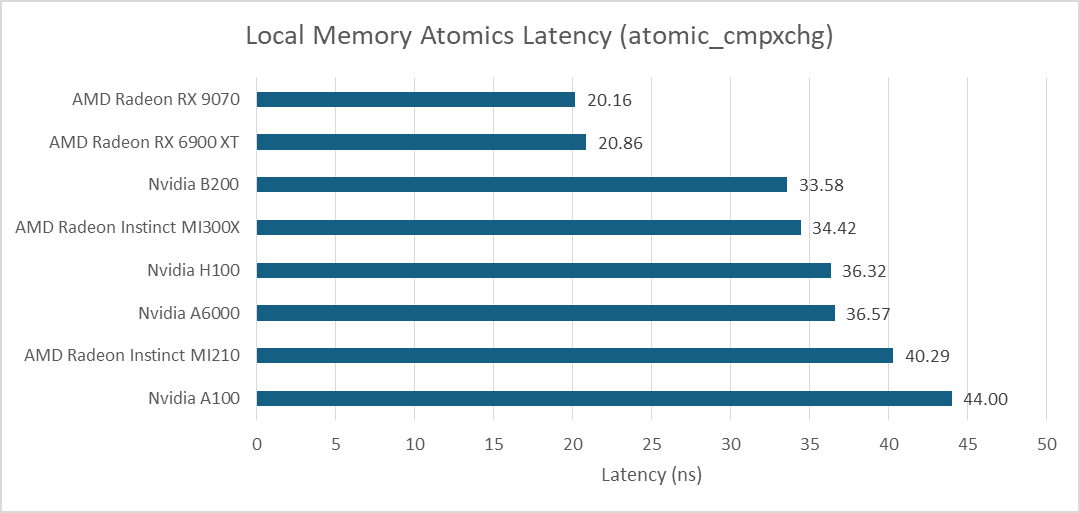 Atomic operations on local memory can be used to exchange data between threads in the same workgroup. On Nvidia, that means threads running on the same SM. Bouncing data between threads using atomic_cmpxchg shows latency on par with AMD’s MI300X. As with pointer chasing latency, B200 gives small incremental improvements over prior generations. AMD’s RDNA line does very well in this test compared to big compute GPUs.